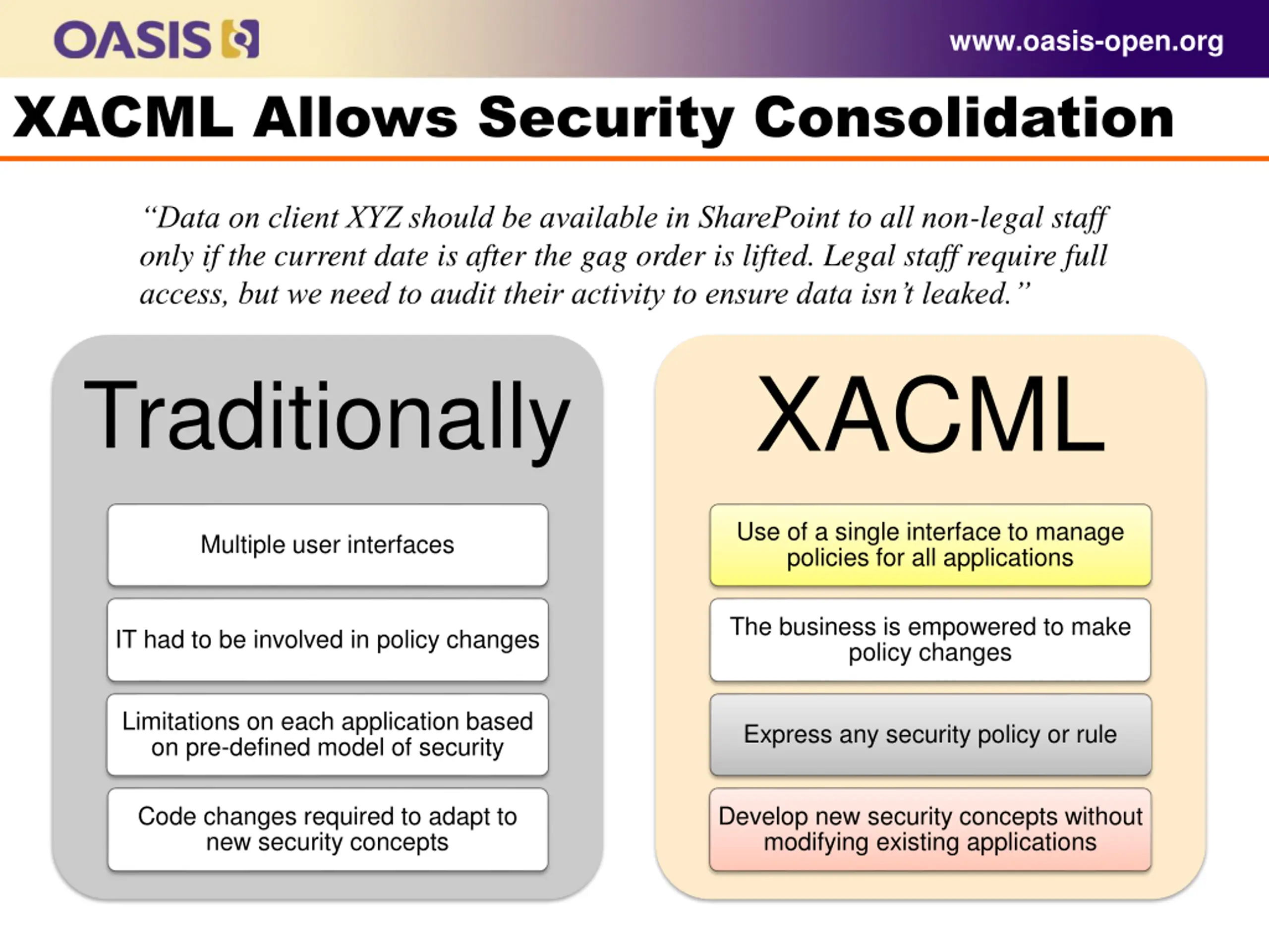 www.oasis-open.org XACML Allows Security Consolidation Data on client XYZ should be available in SharePoint to all non-legal staff only if the current date is after the gag order is lifted. Legal staff require full access, but we need to audit their activity to ensure data isn t leaked. XACML Traditionally Use of a single interface to manage policies for all applications Multiple user interfaces The business is empowered to make policy changes IT had to be involved in policy changes Limitations on each application based on pre-defined model of security Express any security policy or rule Code changes required to adapt to new security concepts Develop new security concepts without modifying existing applications