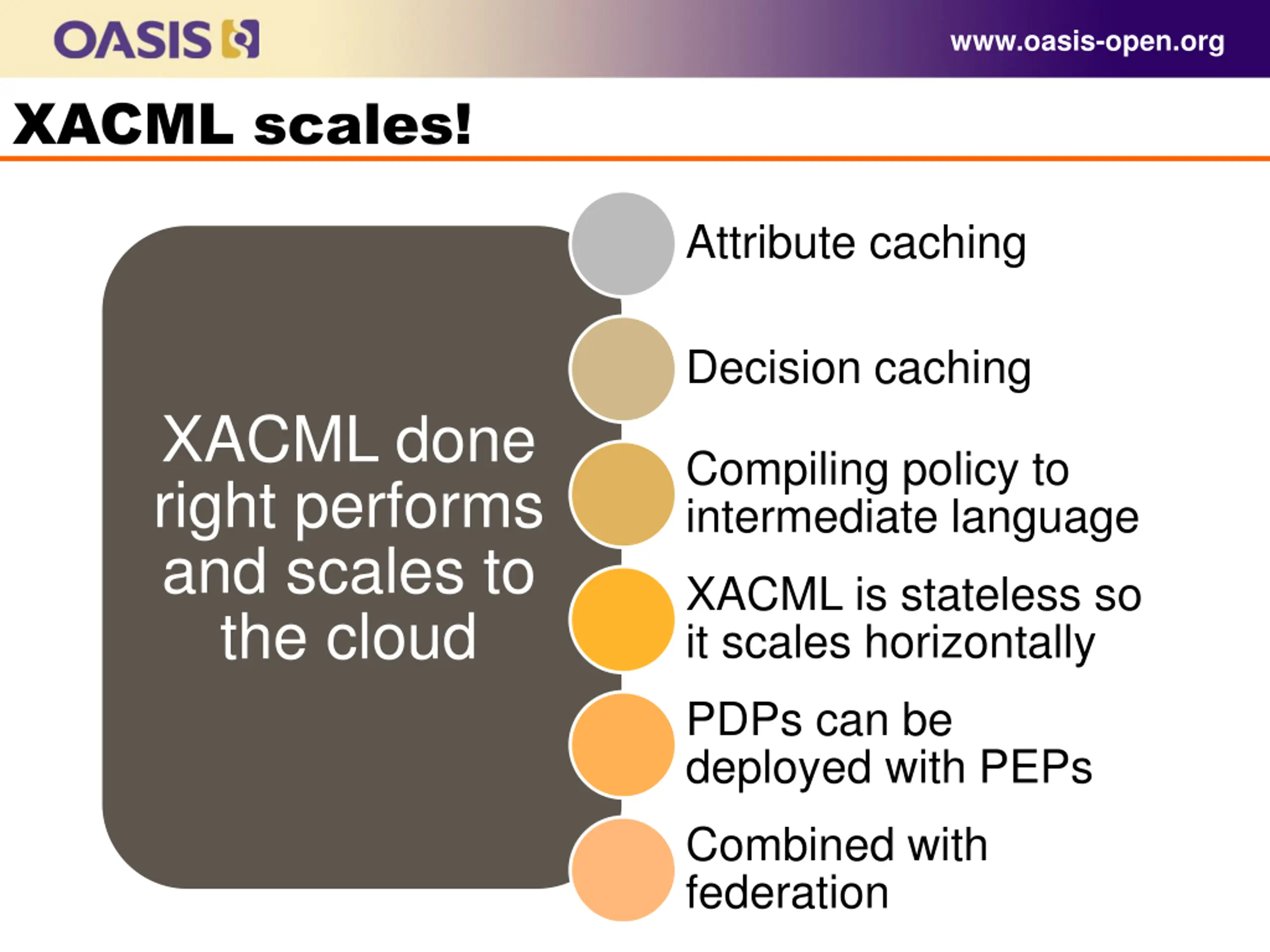 www.oasis-open.org XACML scales! Attribute caching Decision caching XACML done right performs and scales to the cloud Compiling policy to intermediate language XACML is stateless so it scales horizontally PDPs can be deployed with PEPs Combined with federation
