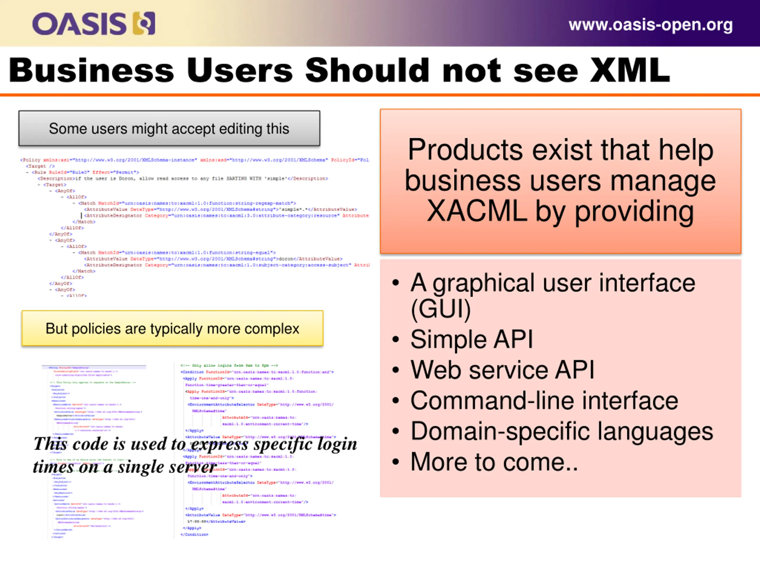 www.oasis-open.org Business Users Should not see XML Some users might accept editing this Products exist that help business users manage XACML by providing A graphical user interface (GUI) Simple API Web service API Command-line interface Domain-specific languages More to come.. But policies are typically more complex This code is used to express specific login times on a single server