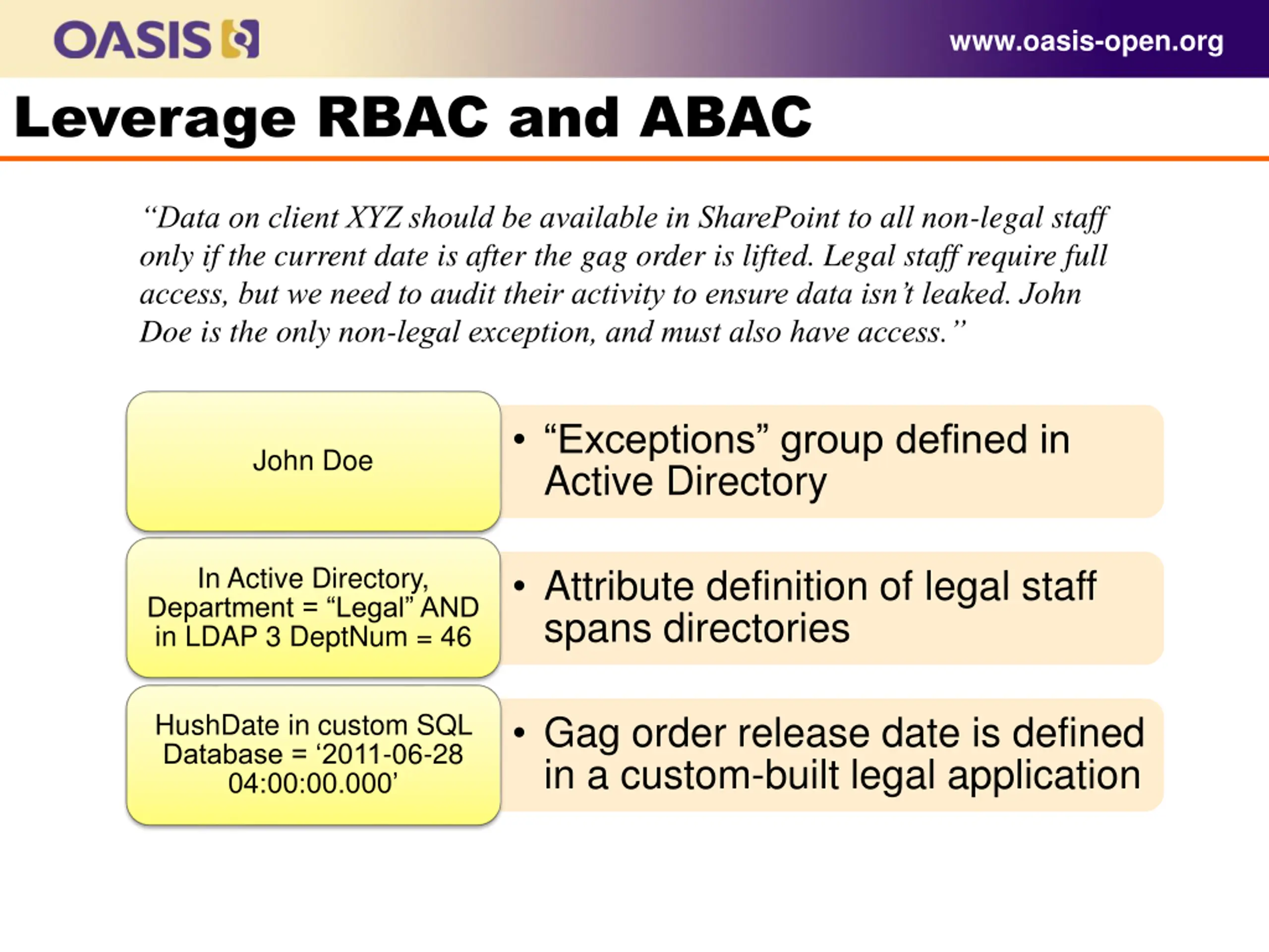 www.oasis-open.org Leverage RBAC and ABAC Data on client XYZ should be available in SharePoint to all non-legal staff only if the current date is after the gag order is lifted. Legal staff require full access, but we need to audit their activity to ensure data isn t leaked. John Doe is the only non-legal exception, and must also have access. Exceptions group defined in Active Directory John Doe In Active Directory, Department = Legal AND in LDAP 3 DeptNum = 46 Attribute definition of legal staff spans directories HushDate in custom SQL Database = 2011-06-28 04:00:00.000 Gag order release date is defined in a custom-built legal application