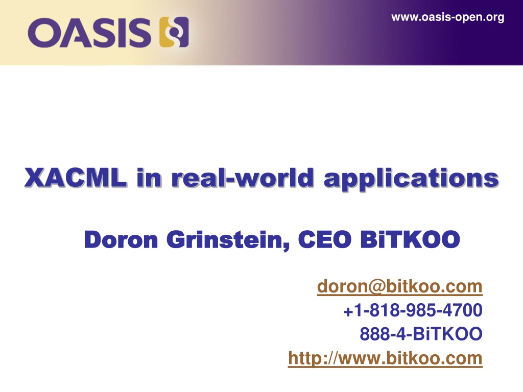 www.oasis-open.org XACML in real-world applications Doron Grinstein, CEO BiTKOO Doron Grinstein, CEO BiTKOO doron@bitkoo.com +1-818-985-4700 888-4-BiTKOO http://www.bitkoo.com
