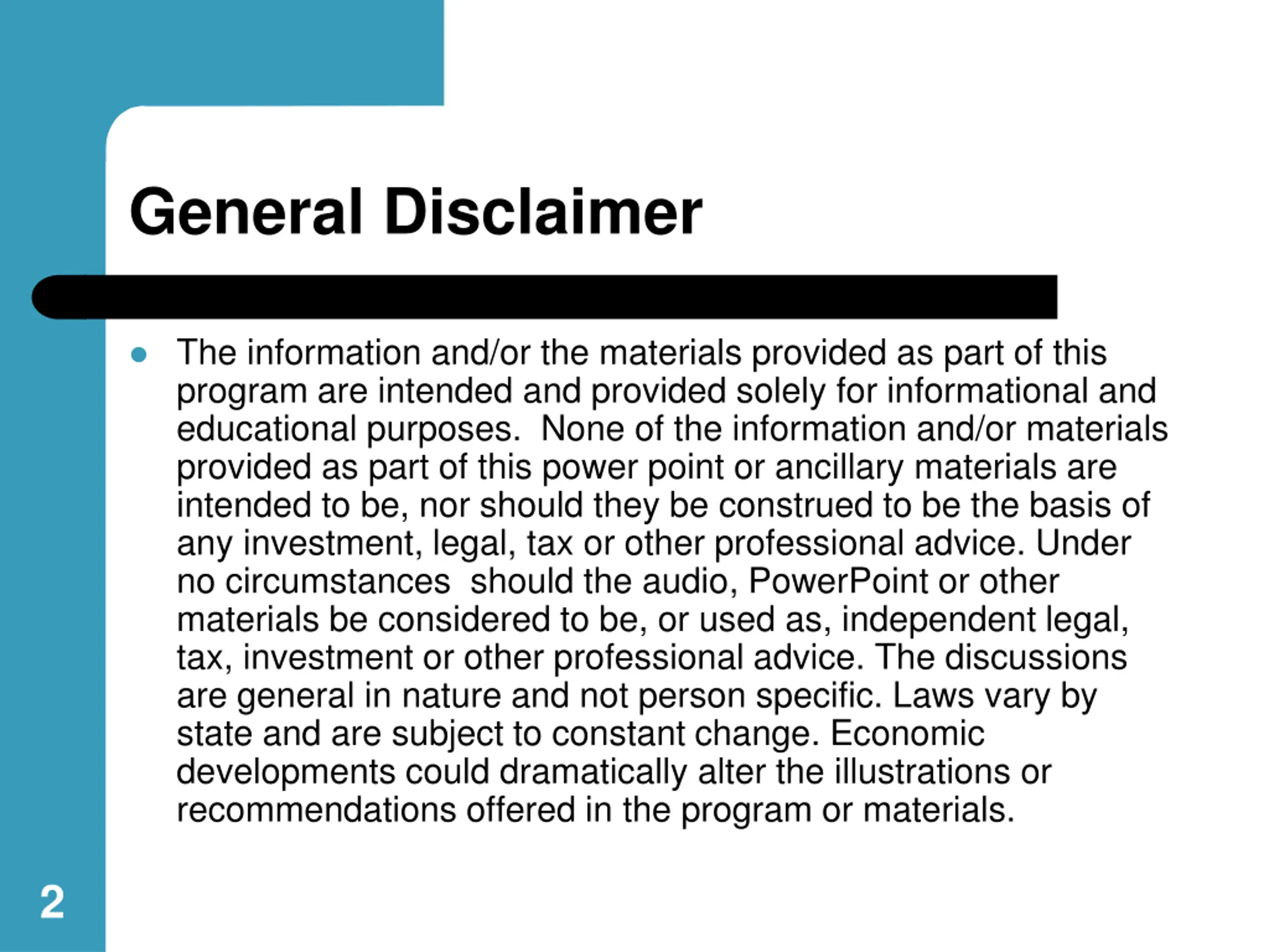 General Disclaimer The information and/or the materials provided as part of this program are intended and provided solely for informational and educational purposes. None of the information and/or materials provided as part of this power point or ancillary materials are intended to be, nor should they be construed to be the basis of any investment, legal, tax or other professional advice. Under no circumstances should the audio, PowerPoint or other materials be considered to be, or used as, independent legal, tax, investment or other professional advice. The discussions are general in nature and not person specific. Laws vary by state and are subject to constant change. Economic developments could dramatically alter the illustrations or recommendations offered in the program or materials. 2