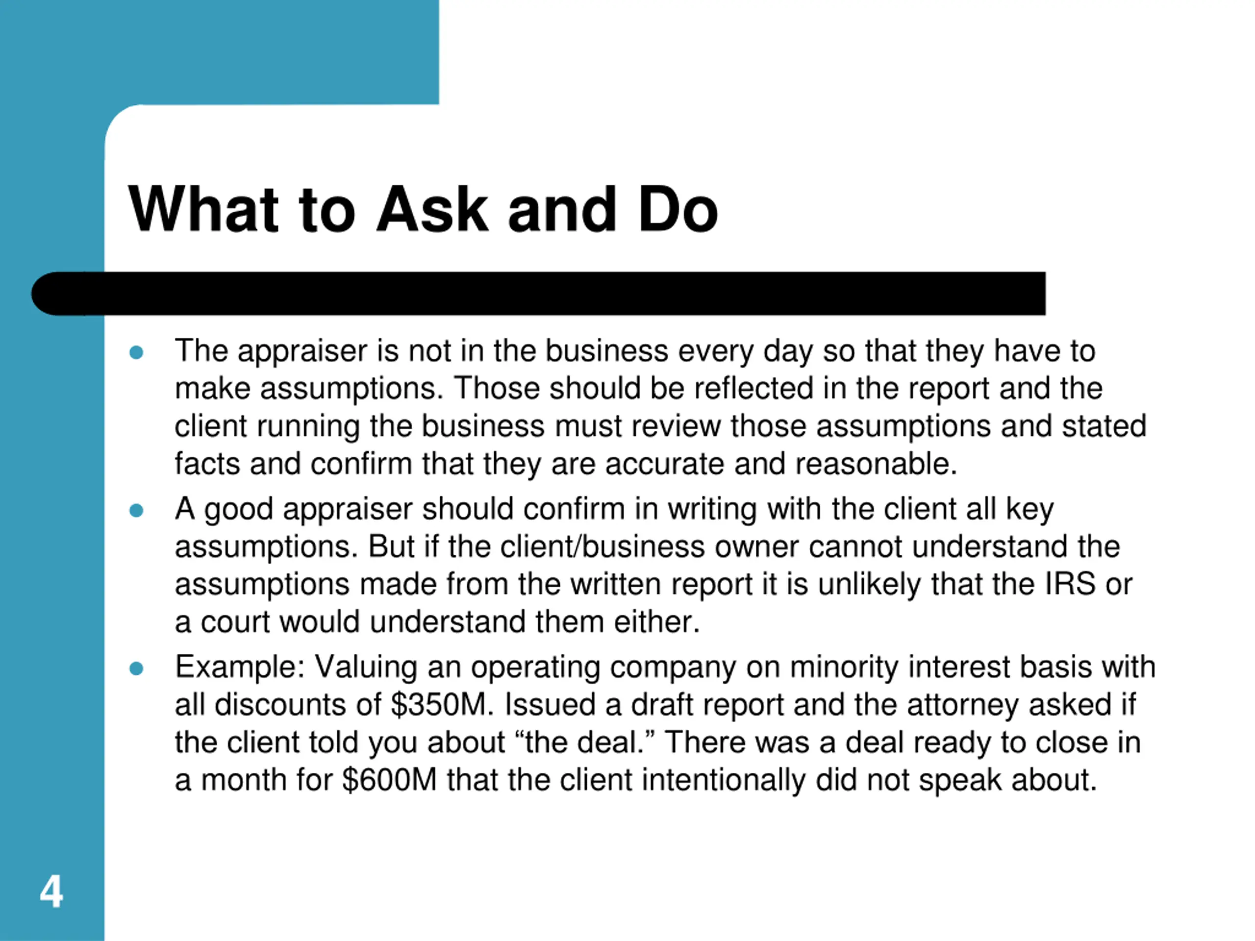 What to Ask and Do The appraiser is not in the business every day so that they have to make assumptions. Those should be reflected in the report and the client running the business must review those assumptions and stated facts and confirm that they are accurate and reasonable. A good appraiser should confirm in writing with the client all key assumptions. But if the client/business owner cannot understand the assumptions made from the written report it is unlikely that the IRS or a court would understand them either. Example: Valuing an operating company on minority interest basis with all discounts of $350M. Issued a draft report and the attorney asked if the client told you about the deal. There was a deal ready to close in a month for $600M that the client intentionally did not speak about. 4