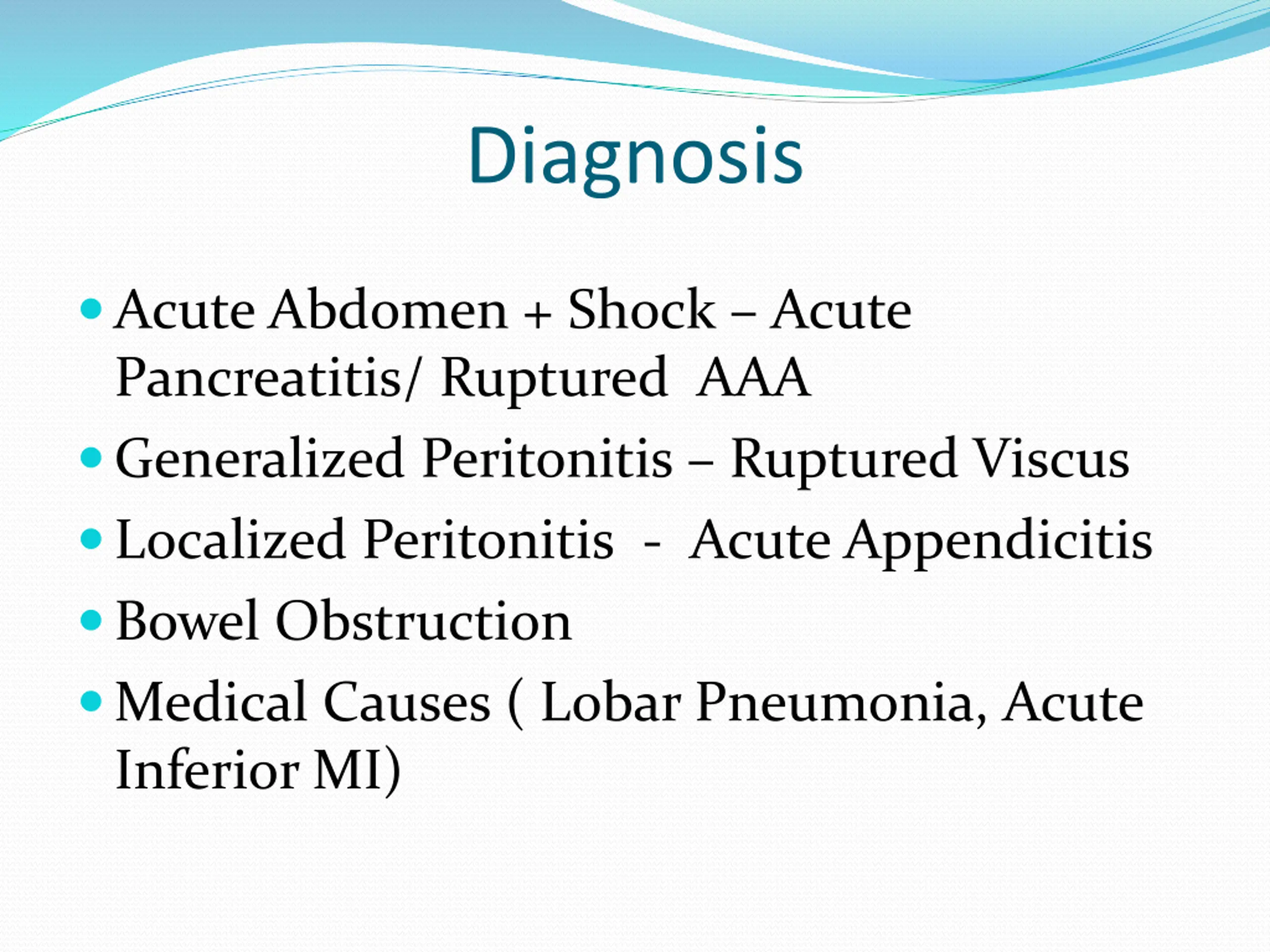 Diagnosis Acute Abdomen + Shock Acute Pancreatitis/ Ruptured AAA Generalized Peritonitis Ruptured Viscus Localized Peritonitis - Acute Appendicitis Bowel Obstruction Medical Causes ( Lobar Pneumonia, Acute Inferior MI)