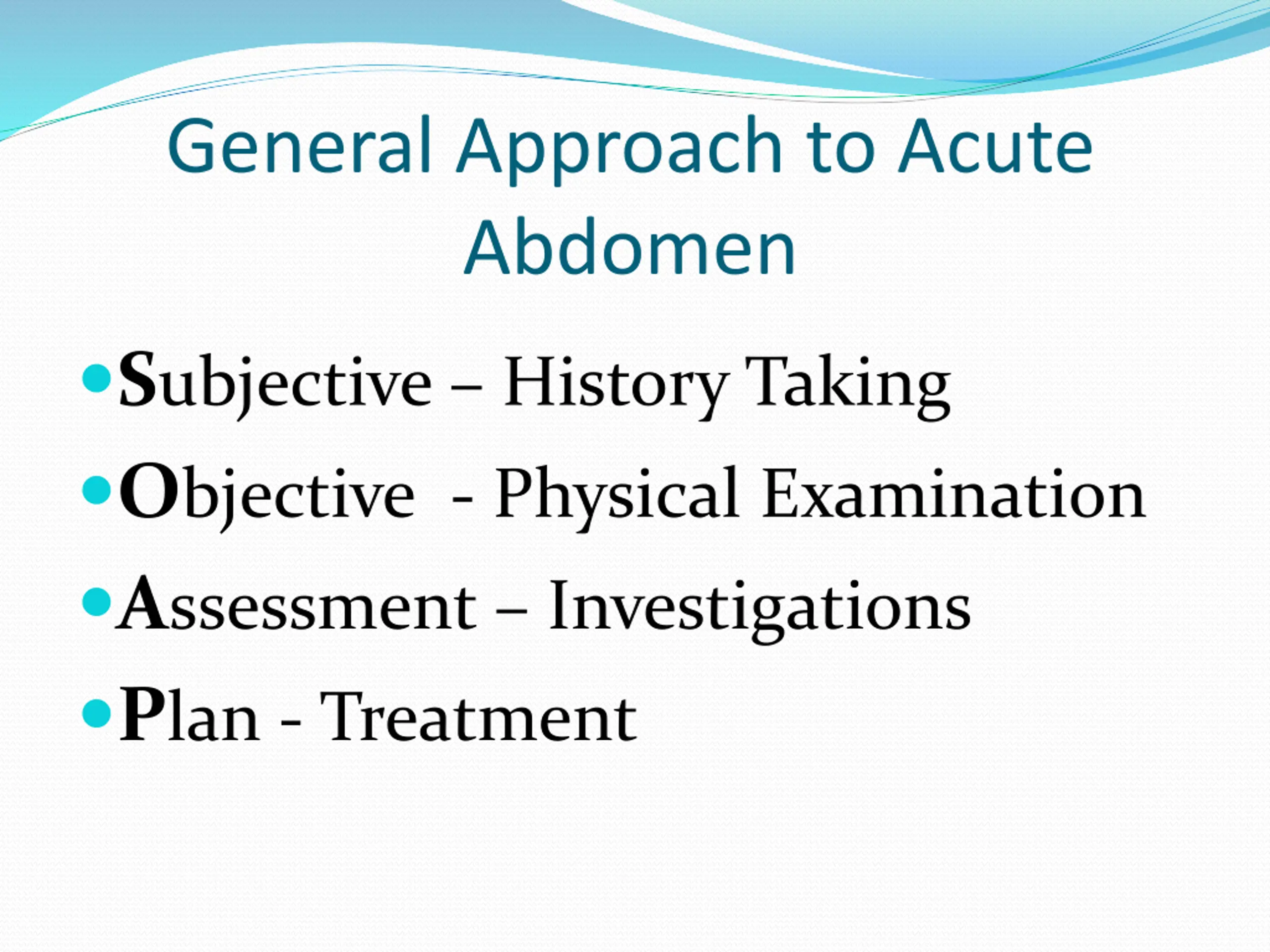 General Approach to Acute Abdomen Subjective History Taking Objective - Physical Examination Assessment Investigations Plan - Treatment