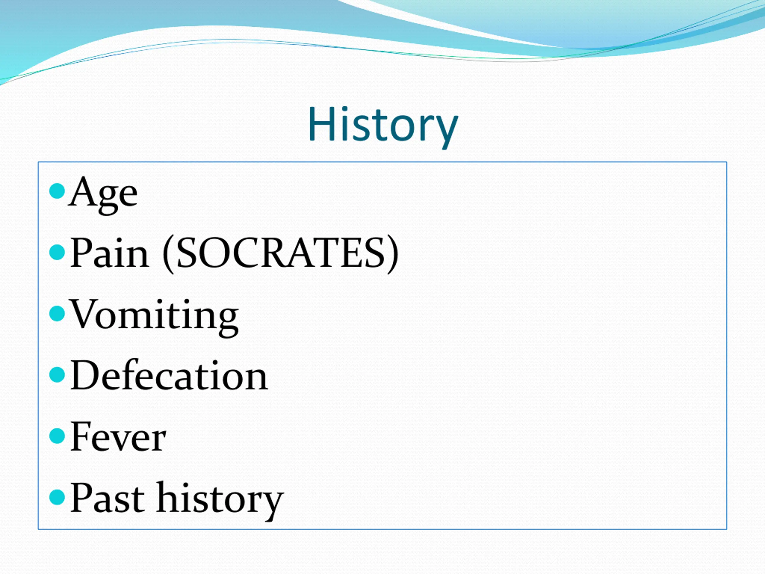 History Age Pain (SOCRATES) Vomiting Defecation Fever Past history