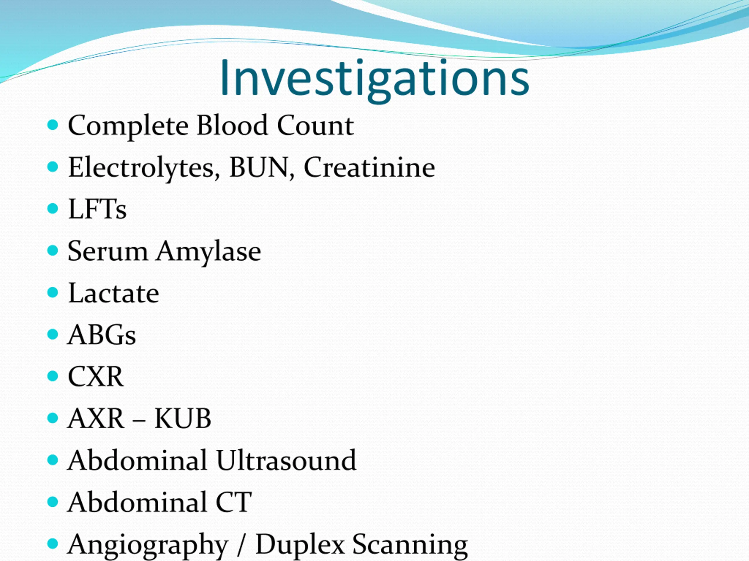 Investigations Complete Blood Count Electrolytes, BUN, Creatinine LFTs Serum Amylase Lactate ABGs CXR AXR KUB Abdominal Ultrasound Abdominal CT Angiography / Duplex Scanning