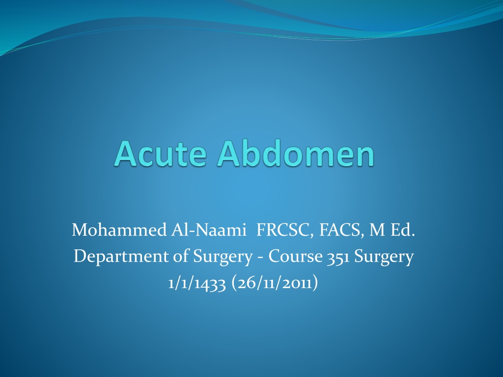 Learn about the definition, general approach, common causes, investigations, diagnosis, and management of acute abdomen through case scenarios presented by Dr. Mohammed Al-Naami, a surgeon with expertise in the field. Discover the urgency of identifying and treating acute abdomen to prevent serious complications.