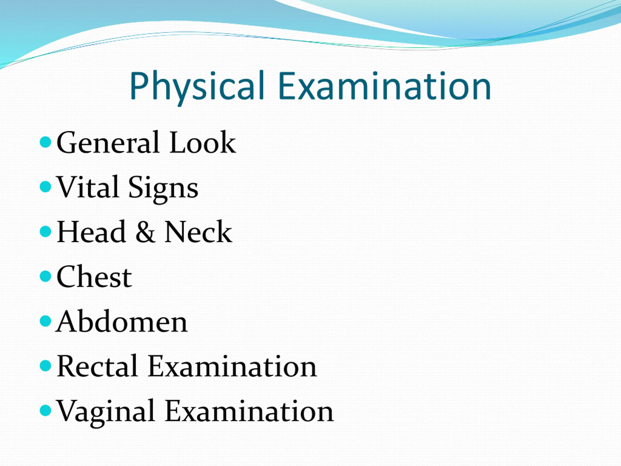 Physical Examination General Look Vital Signs Head & Neck Chest Abdomen Rectal Examination Vaginal Examination