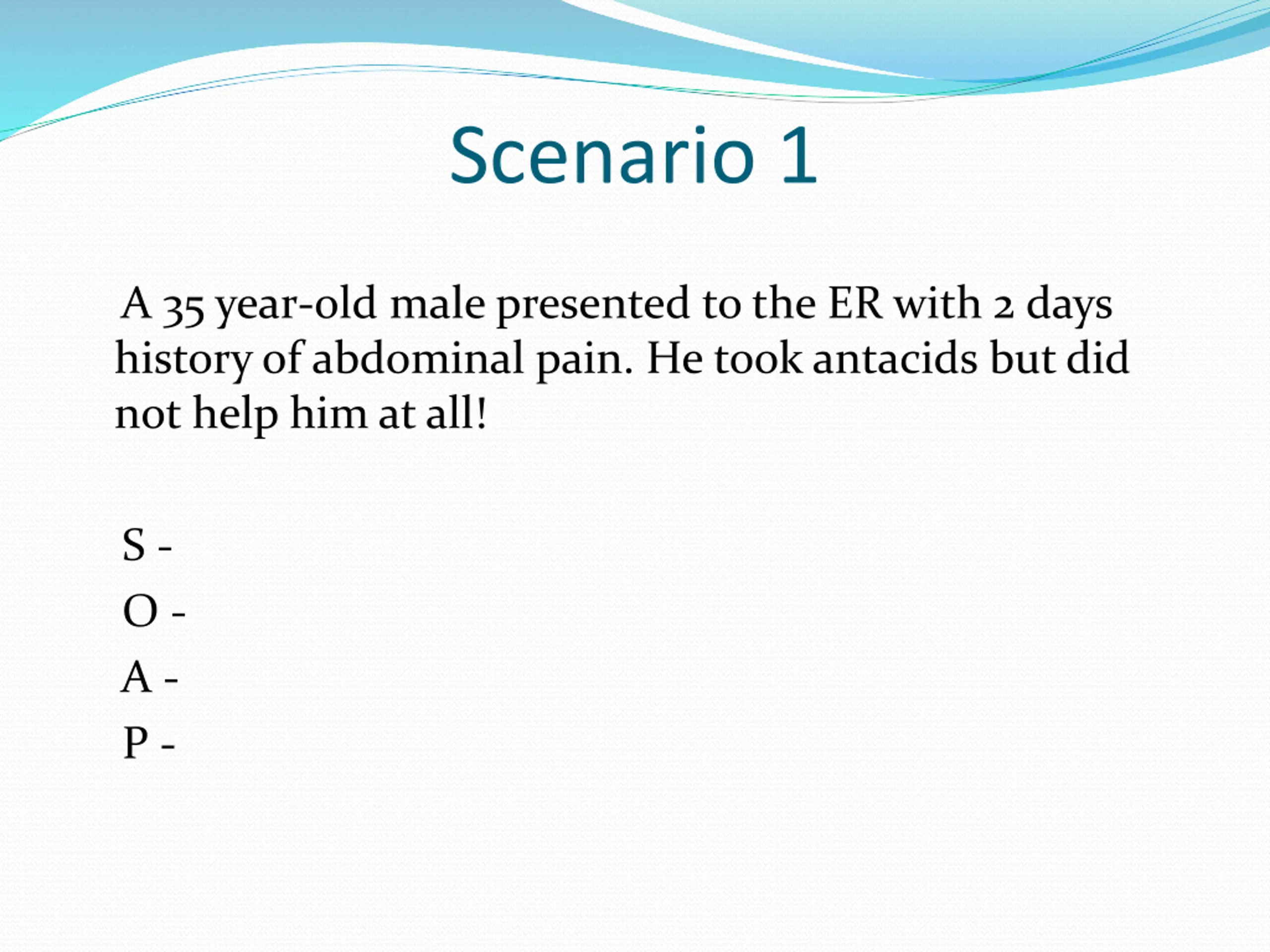 Scenario 1 A 35 year-old male presented to the ER with 2 days history of abdominal pain. He took antacids but did not help him at all! S - O - A - P -