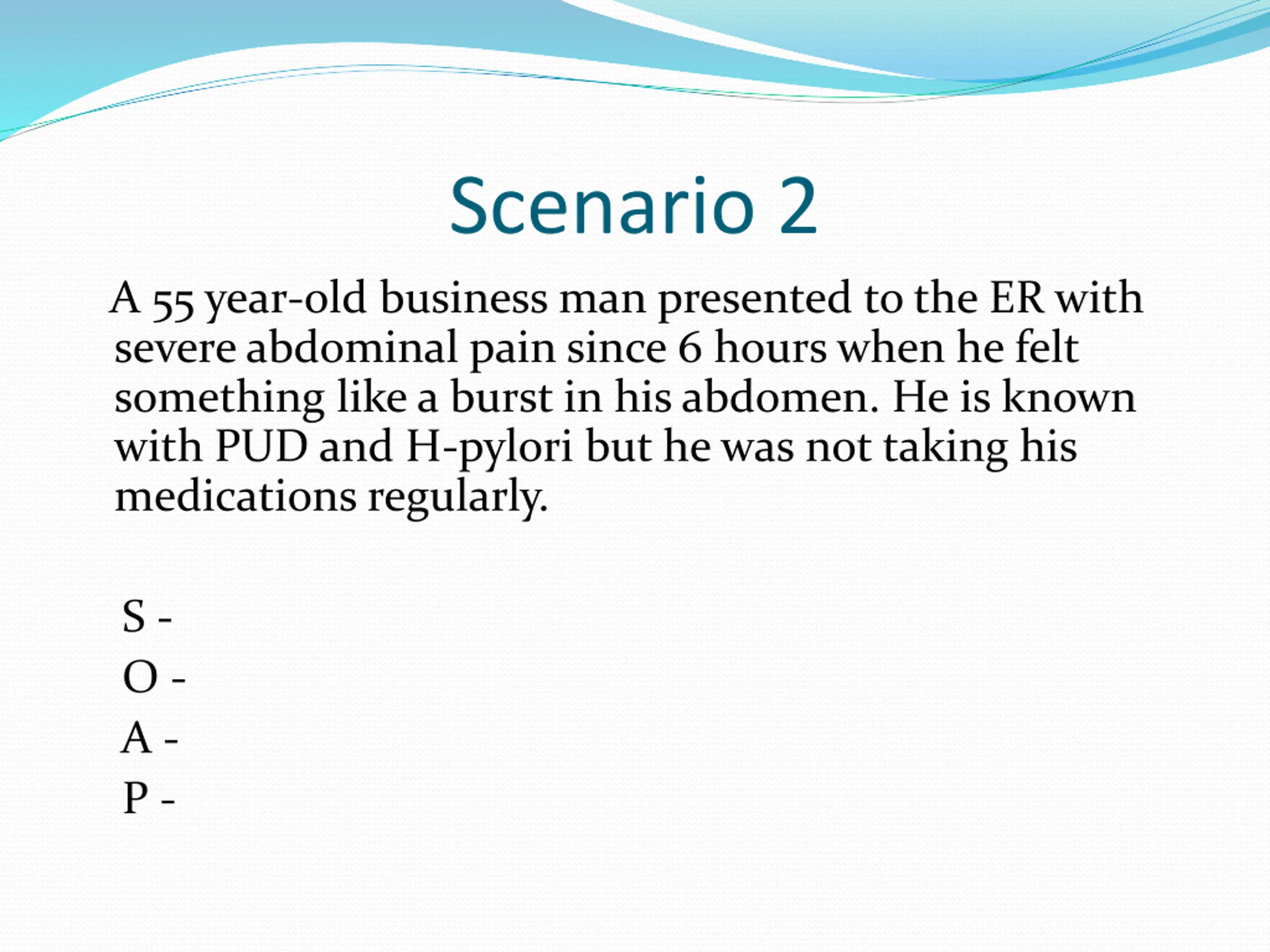Scenario 2 A 55 year-old business man presented to the ER with severe abdominal pain since 6 hours when he felt something like a burst in his abdomen. He is known with PUD and H-pylori but he was not taking his medications regularly. S - O - A - P -