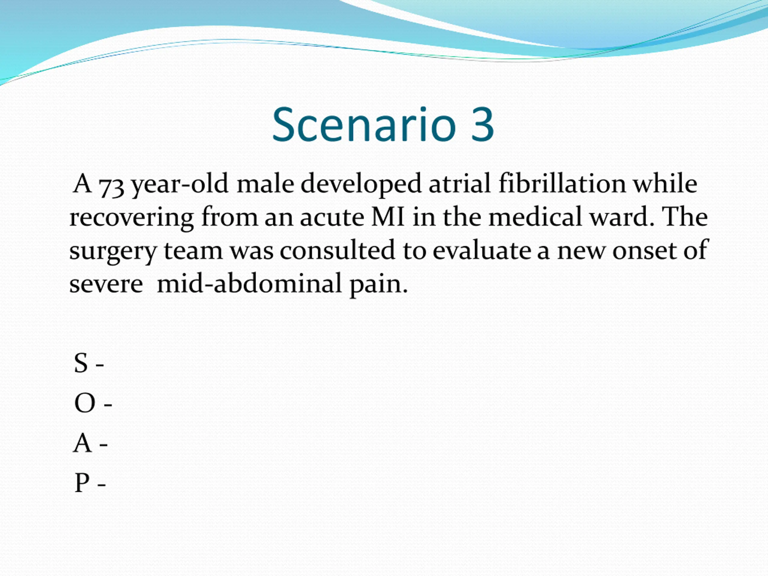Scenario 3 A 73 year-old male developed atrial fibrillation while recovering from an acute MI in the medical ward. The surgery team was consulted to evaluate a new onset of severe mid-abdominal pain. S - O - A - P -