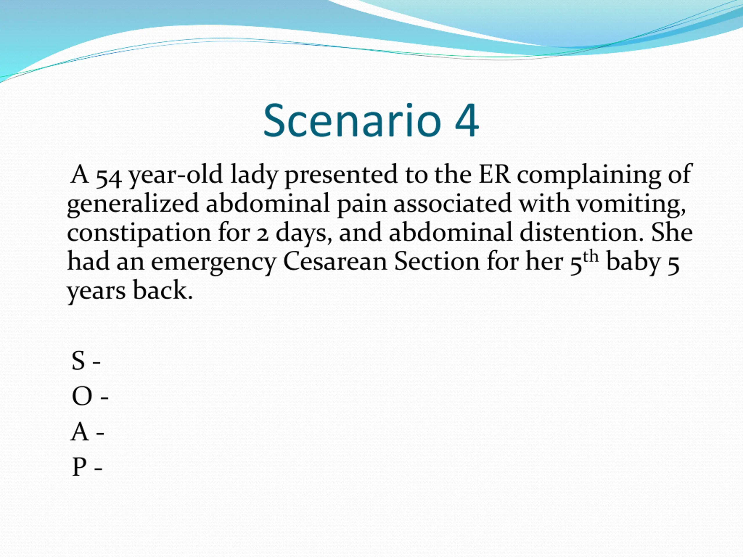 Scenario 4 A 54 year-old lady presented to the ER complaining of generalized abdominal pain associated with vomiting, constipation for 2 days, and abdominal distention. She had an emergency Cesarean Section for her 5thbaby 5 years back. S - O - A - P -