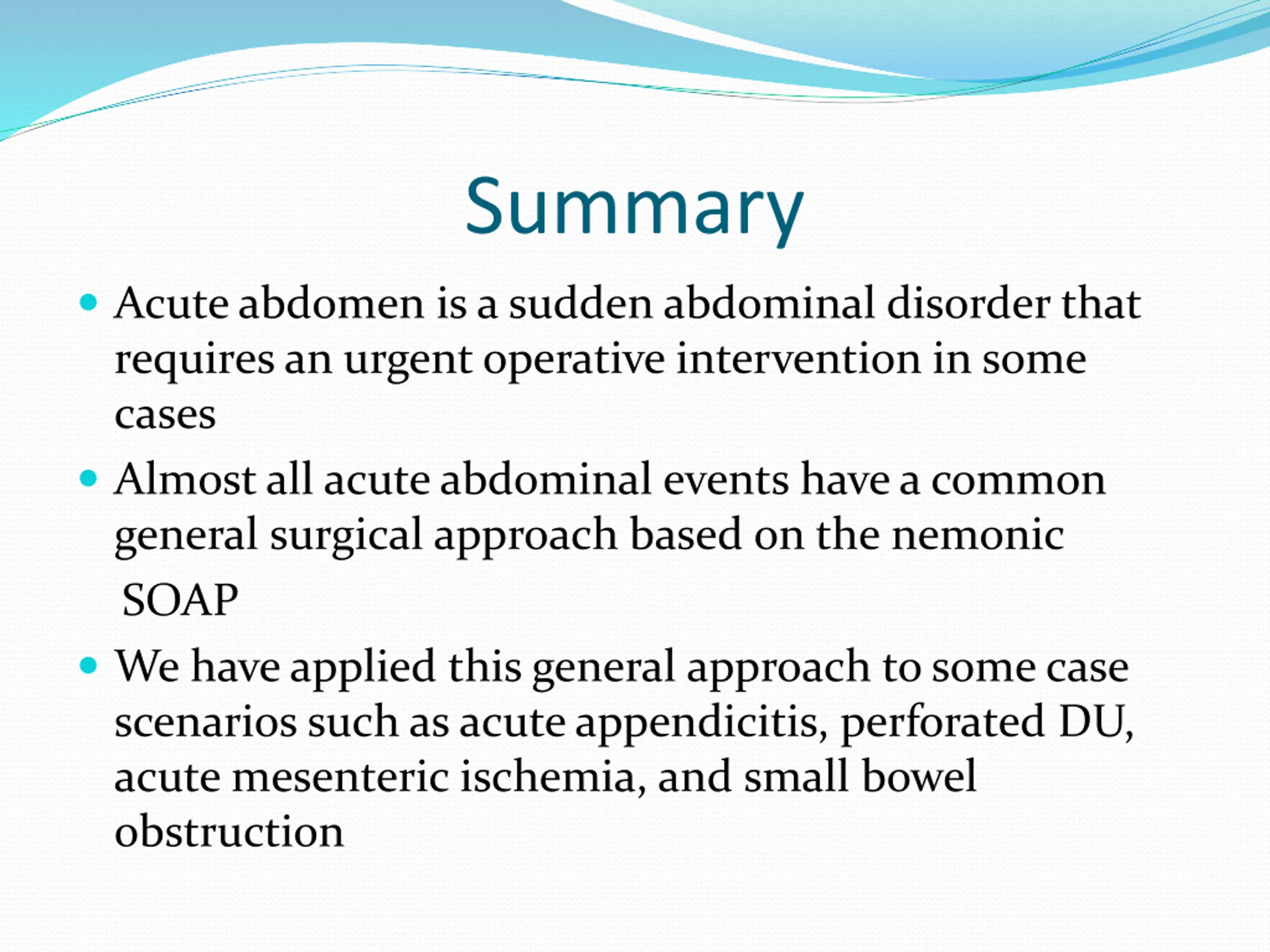 Summary Acute abdomen is a sudden abdominal disorder that requires an urgent operative intervention in some cases Almost all acute abdominal events have a common general surgical approach based on the nemonic SOAP We have applied this general approach to some case scenarios such as acute appendicitis, perforated DU, acute mesenteric ischemia, and small bowel obstruction