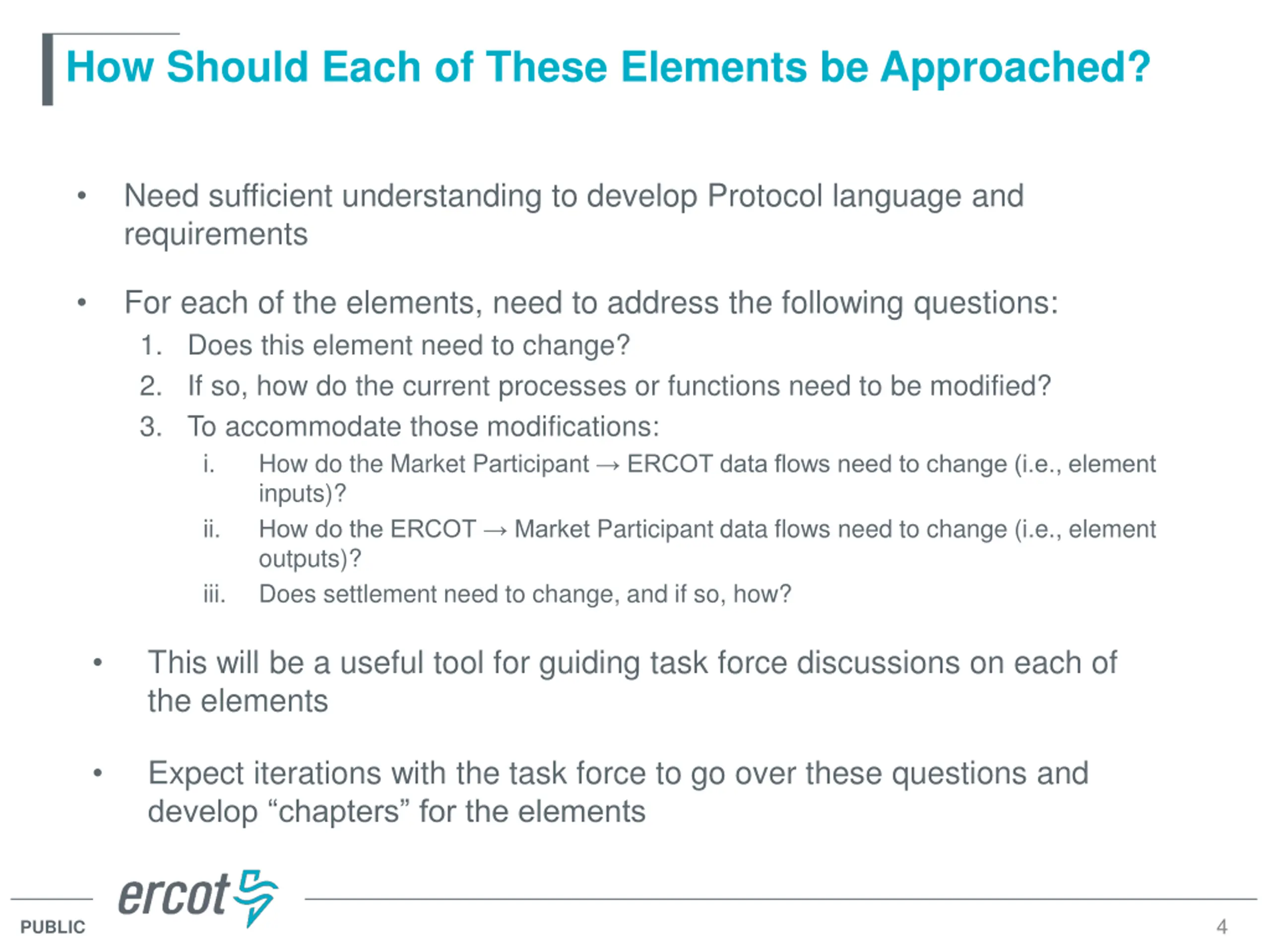 How Should Each of These Elements be Approached? Need sufficient understanding to develop Protocol language and requirements For each of the elements, need to address the following questions: 1. Does this element need to change? 2. If so, how do the current processes or functions need to be modified? 3. To accommodate those modifications: i. How do the Market Participant ERCOT data flows need to change (i.e., element inputs)? ii. How do the ERCOT Market Participant data flows need to change (i.e., element outputs)? iii. Does settlement need to change, and if so, how? This will be a useful tool for guiding task force discussions on each of the elements Expect iterations with the task force to go over these questions and develop chapters for the elements 4 PUBLIC