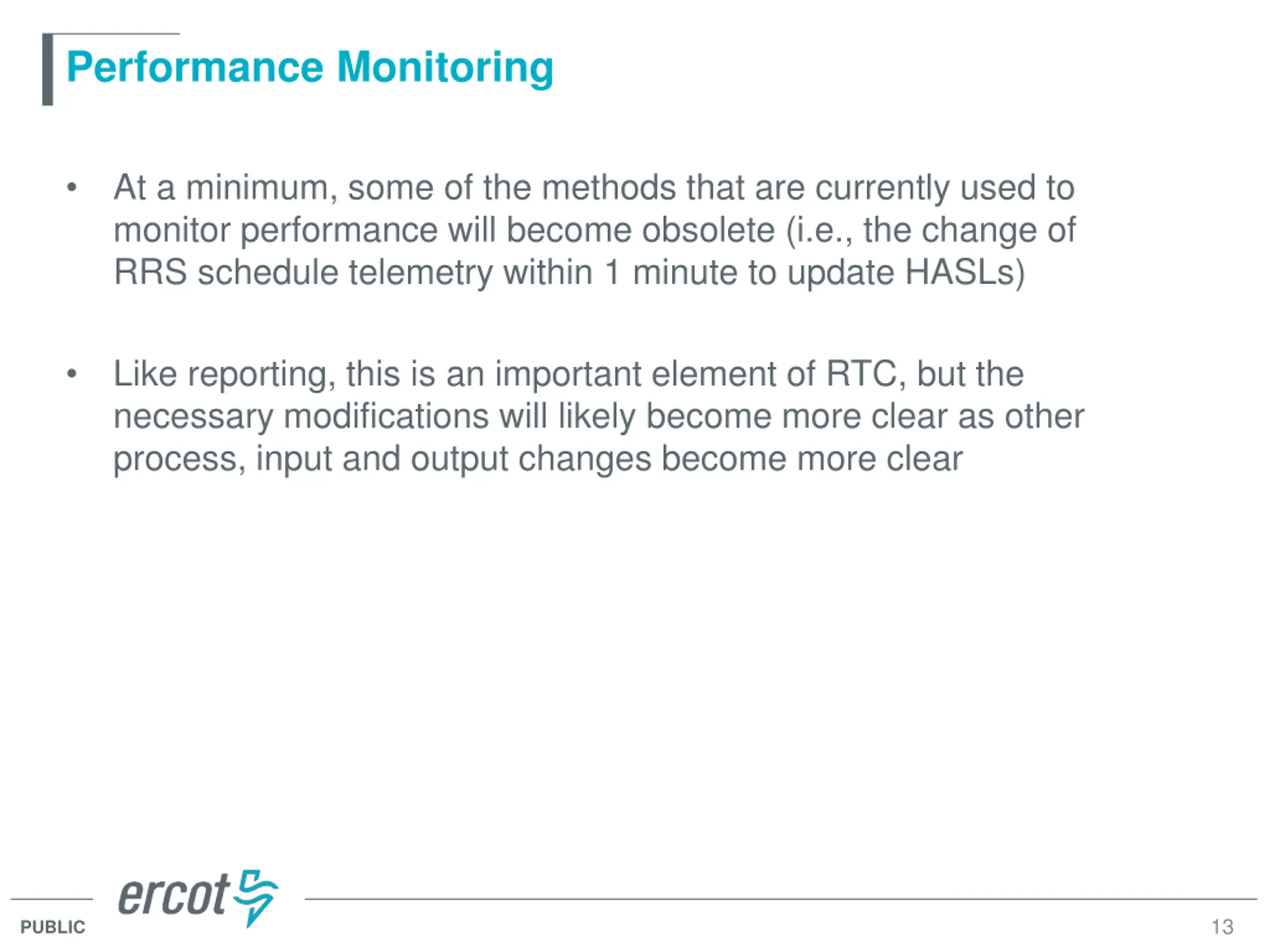 Performance Monitoring At a minimum, some of the methods that are currently used to monitor performance will become obsolete (i.e., the change of RRS schedule telemetry within 1 minute to update HASLs) Like reporting, this is an important element of RTC, but the necessary modifications will likely become more clear as other process, input and output changes become more clear 13 PUBLIC