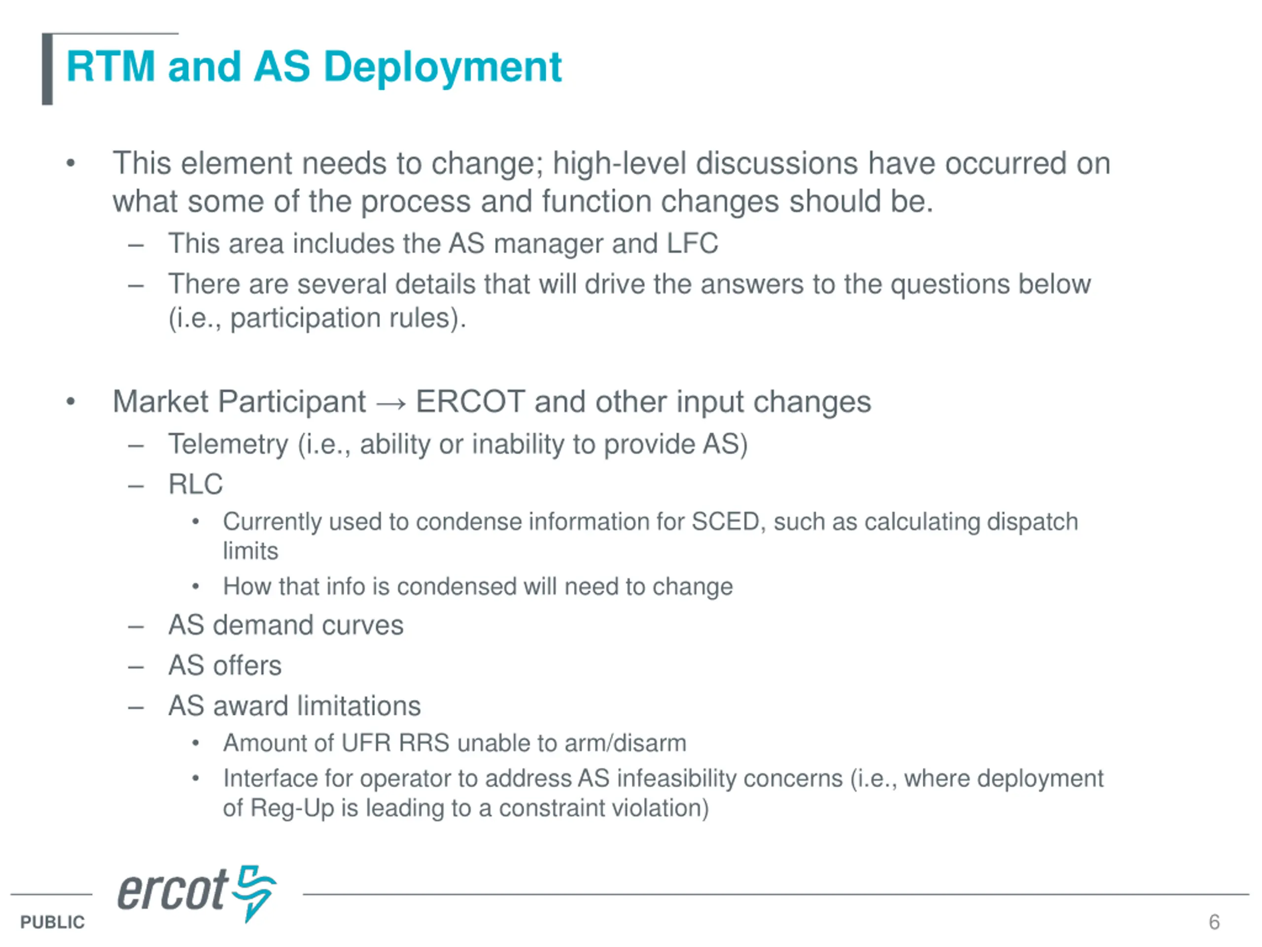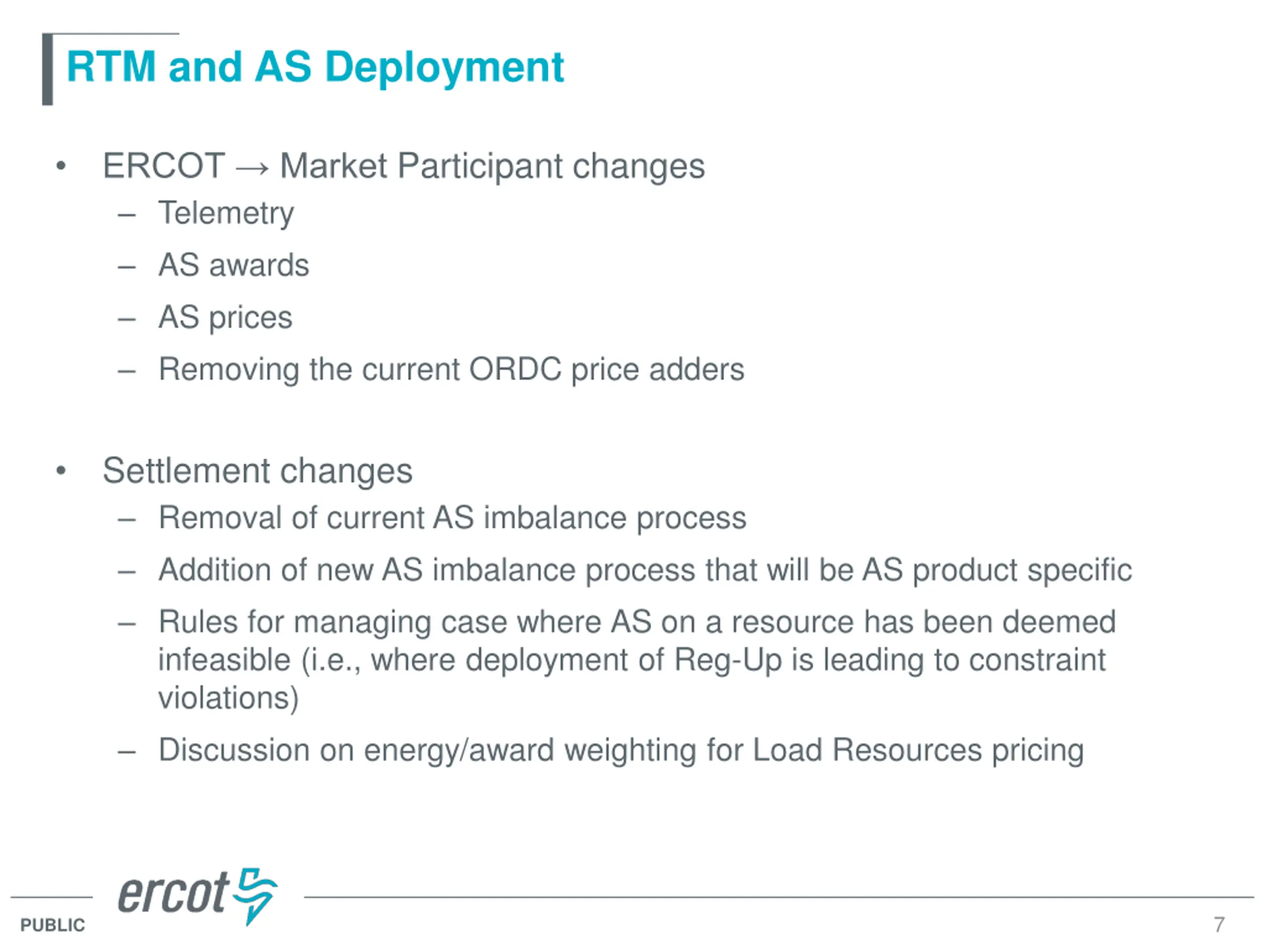 RTM and AS Deployment This element needs to change; high-level discussions have occurred on what some of the process and function changes should be. This area includes the AS manager and LFC There are several details that will drive the answers to the questions below (i.e., participation rules). Market Participant ERCOT and other input changes Telemetry (i.e., ability or inability to provide AS) RLC Currently used to condense information for SCED, such as calculating dispatch limits How that info is condensed will need to change AS demand curves AS offers AS award limitations Amount of UFR RRS unable to arm/disarm Interface for operator to address AS infeasibility concerns (i.e., where deployment of Reg-Up is leading to a constraint violation) 6 PUBLIC