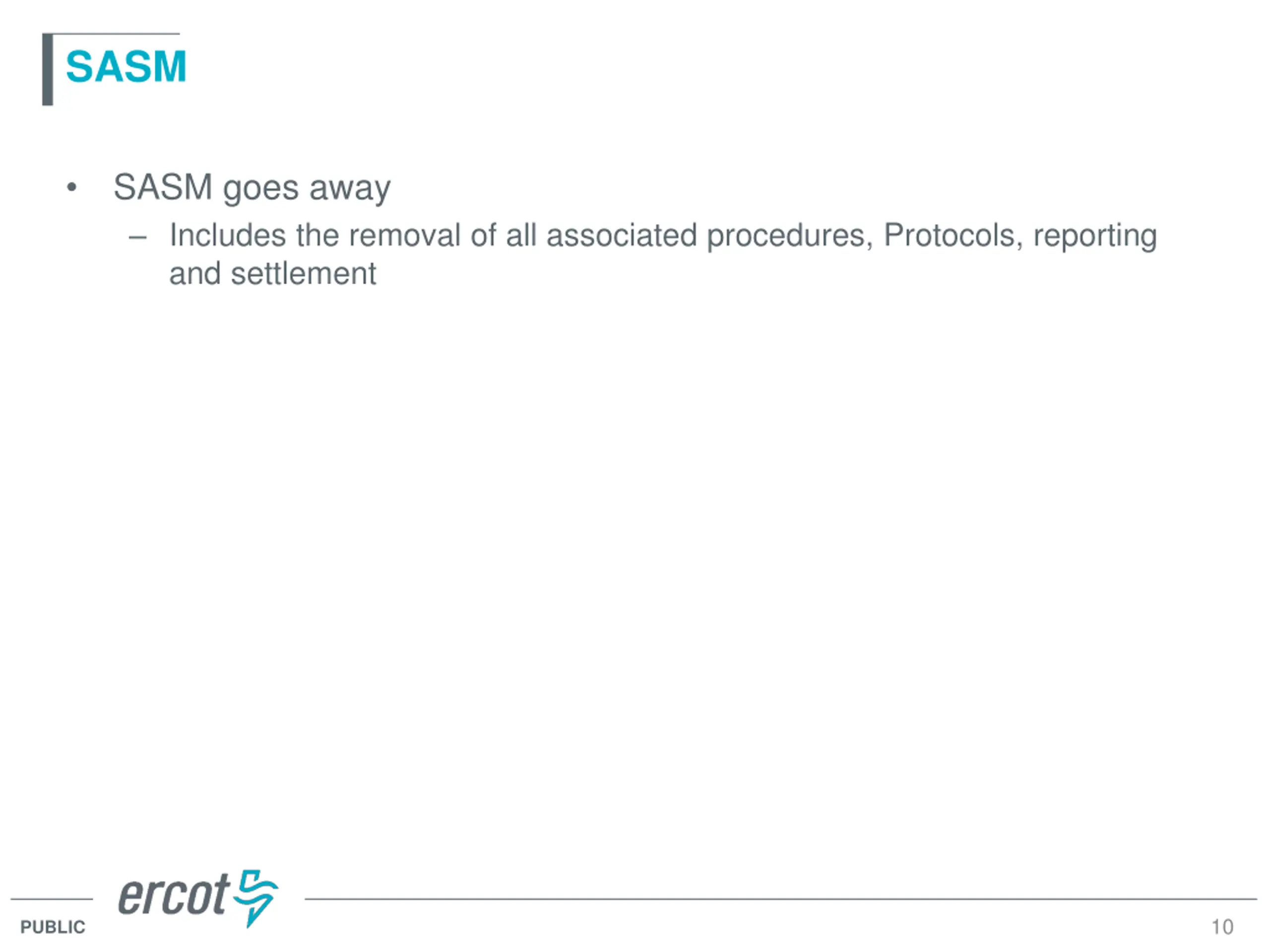 SASM SASM goes away Includes the removal of all associated procedures, Protocols, reporting and settlement 10 PUBLIC