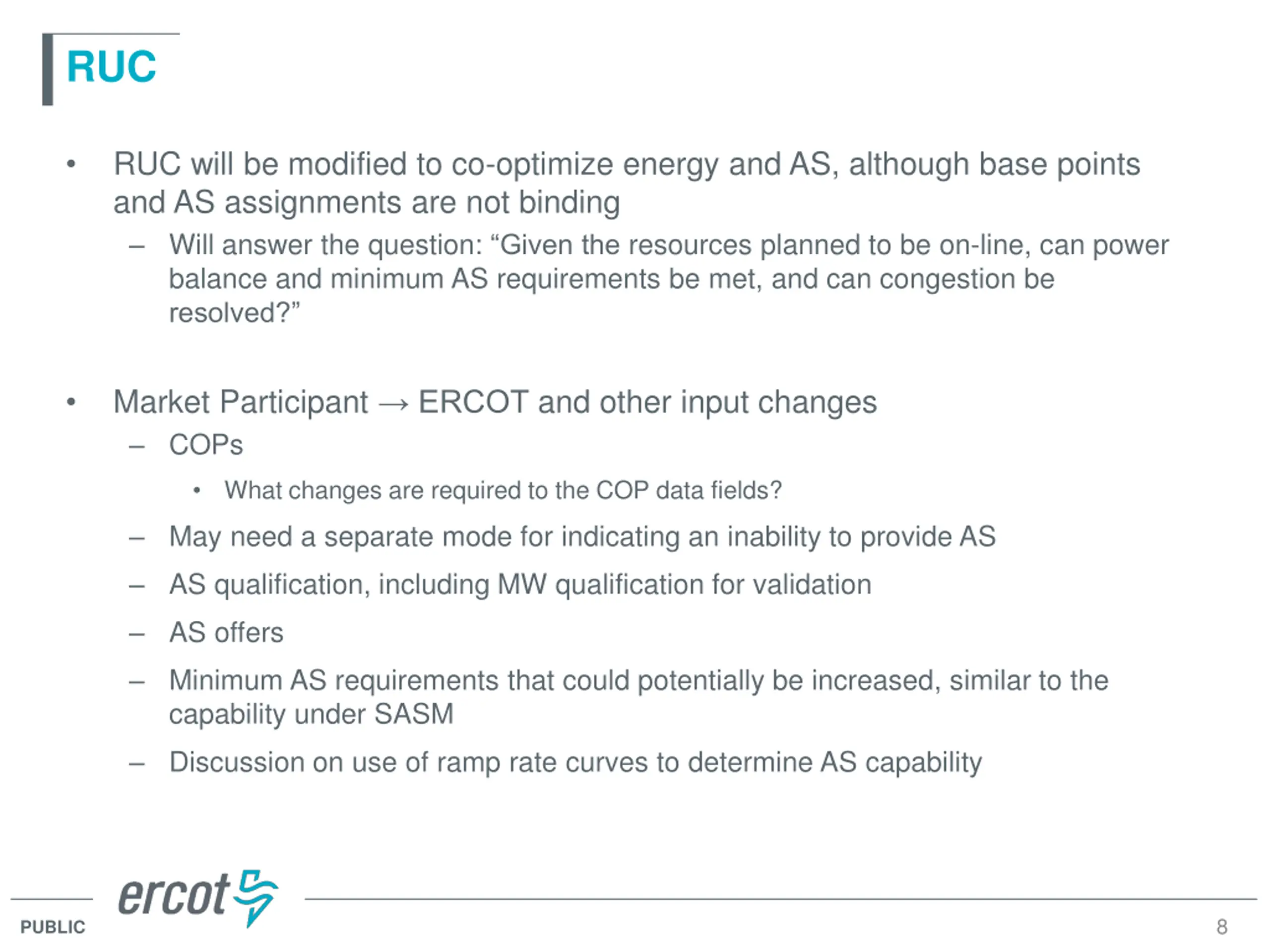RUC RUC will be modified to co-optimize energy and AS, although base points and AS assignments are not binding Will answer the question: Given the resources planned to be on-line, can power balance and minimum AS requirements be met, and can congestion be resolved? Market Participant ERCOT and other input changes COPs What changes are required to the COP data fields? May need a separate mode for indicating an inability to provide AS AS qualification, including MW qualification for validation AS offers Minimum AS requirements that could potentially be increased, similar to the capability under SASM Discussion on use of ramp rate curves to determine AS capability 8 PUBLIC