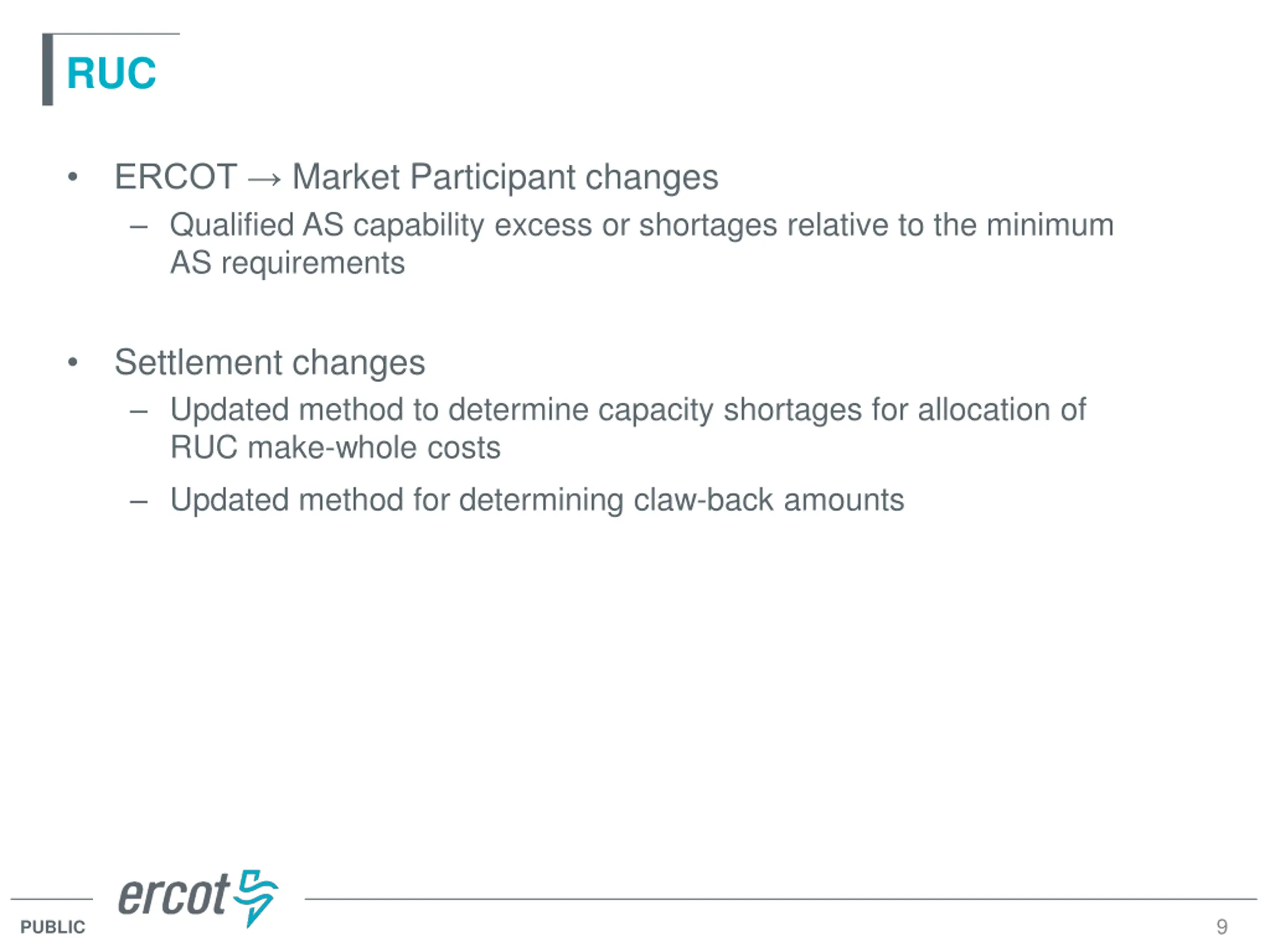RUC ERCOT Market Participant changes Qualified AS capability excess or shortages relative to the minimum AS requirements Settlement changes Updated method to determine capacity shortages for allocation of RUC make-whole costs Updated method for determining claw-back amounts 9 PUBLIC