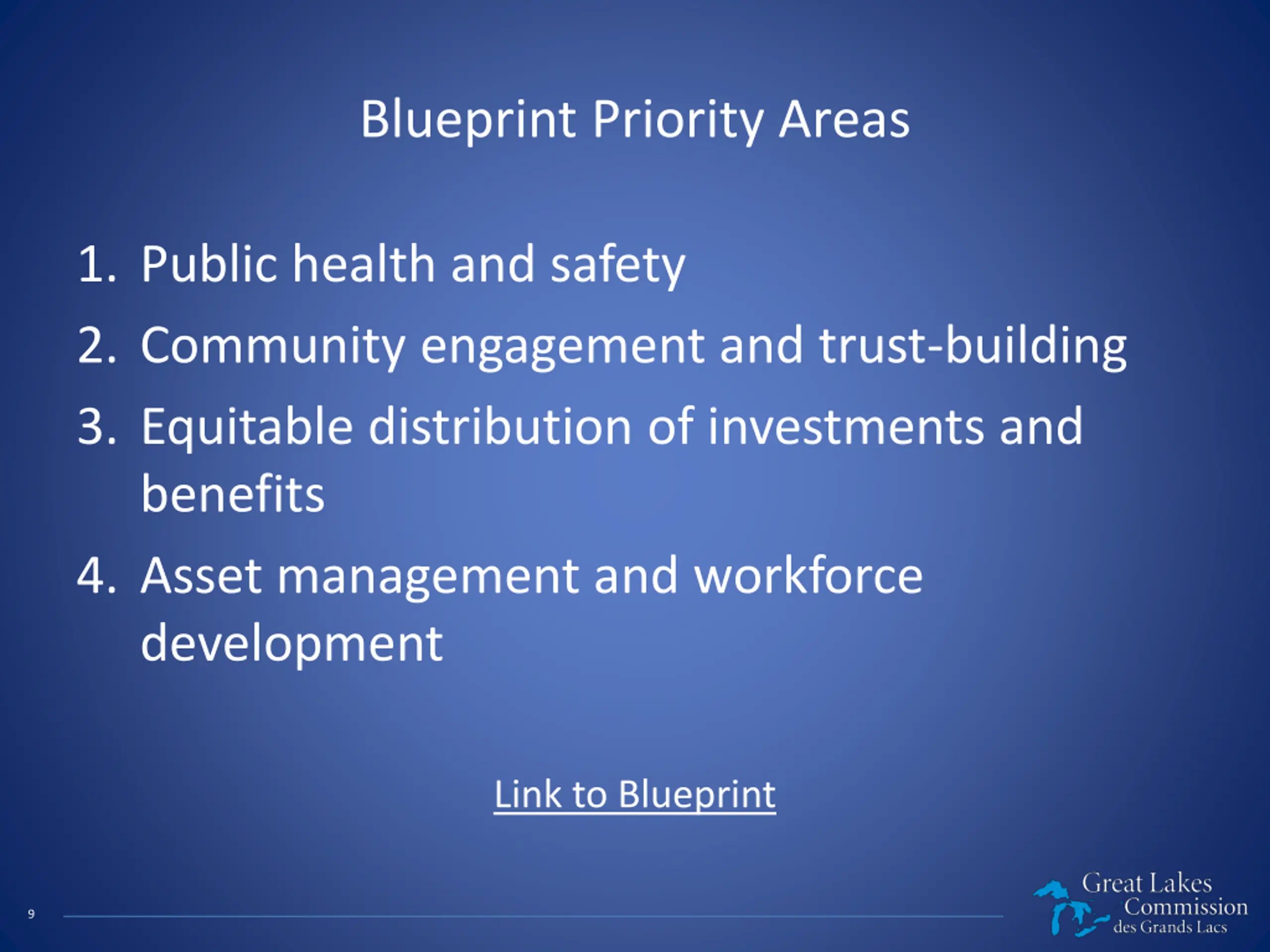 Great Lakes Commission, established in 1955, recommends policies for the balanced use of water resources. The blueprint discusses funding, regional working groups, and questions addressed to enhance infrastructure. It explores finalizing the blueprint through public feedback and focuses on water infrastructure priorities to address inequity and build climate resiliency.