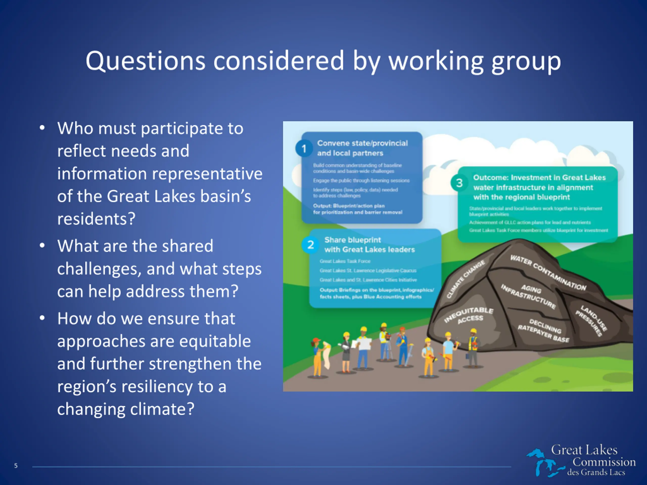Questions considered by working group Who must participate to reflect needs and information representative of the Great Lakes basin s residents? What are the shared challenges, and what steps can help address them? How do we ensure that approaches are equitable and further strengthen the region s resiliency to a changing climate? 5