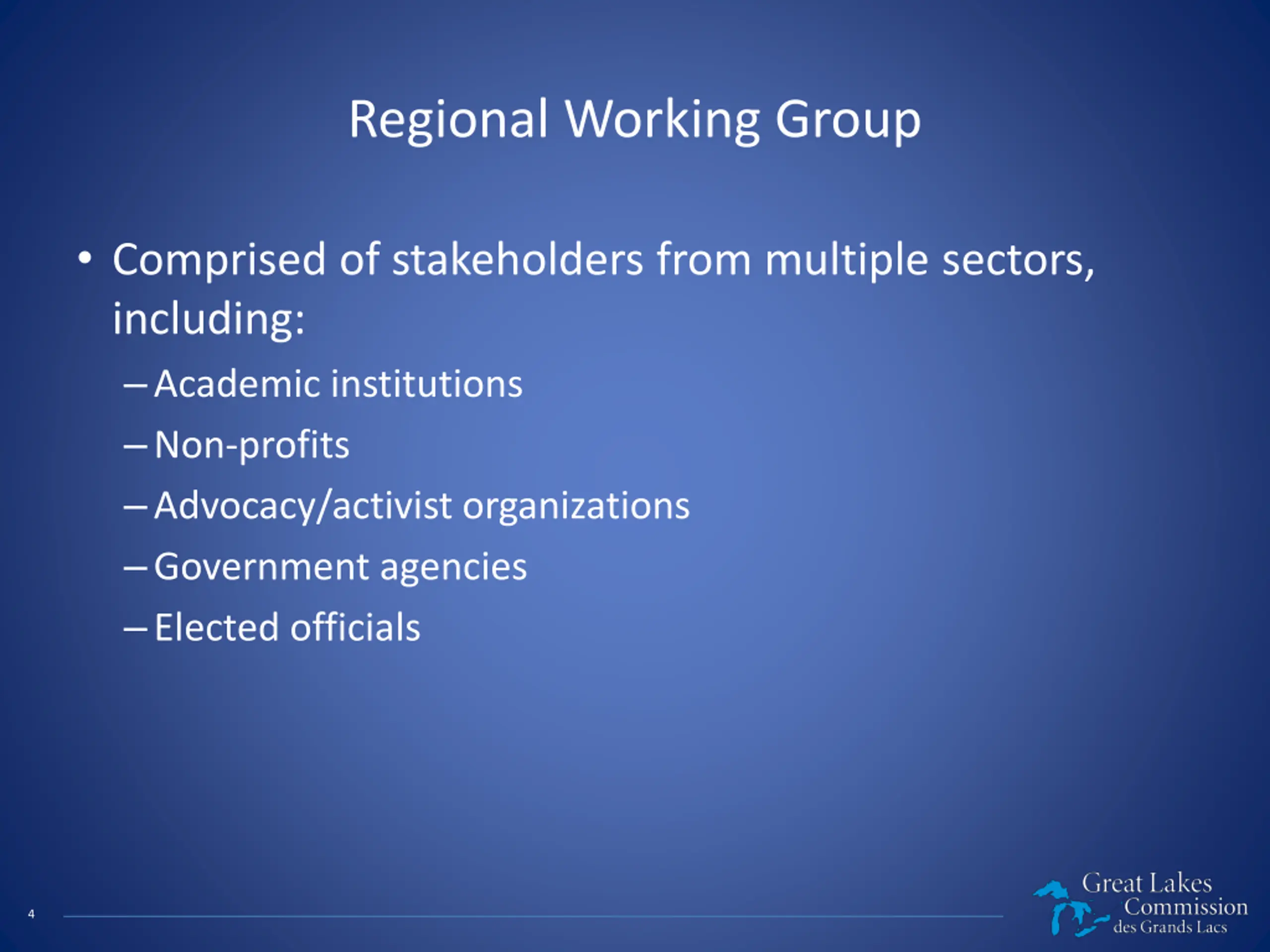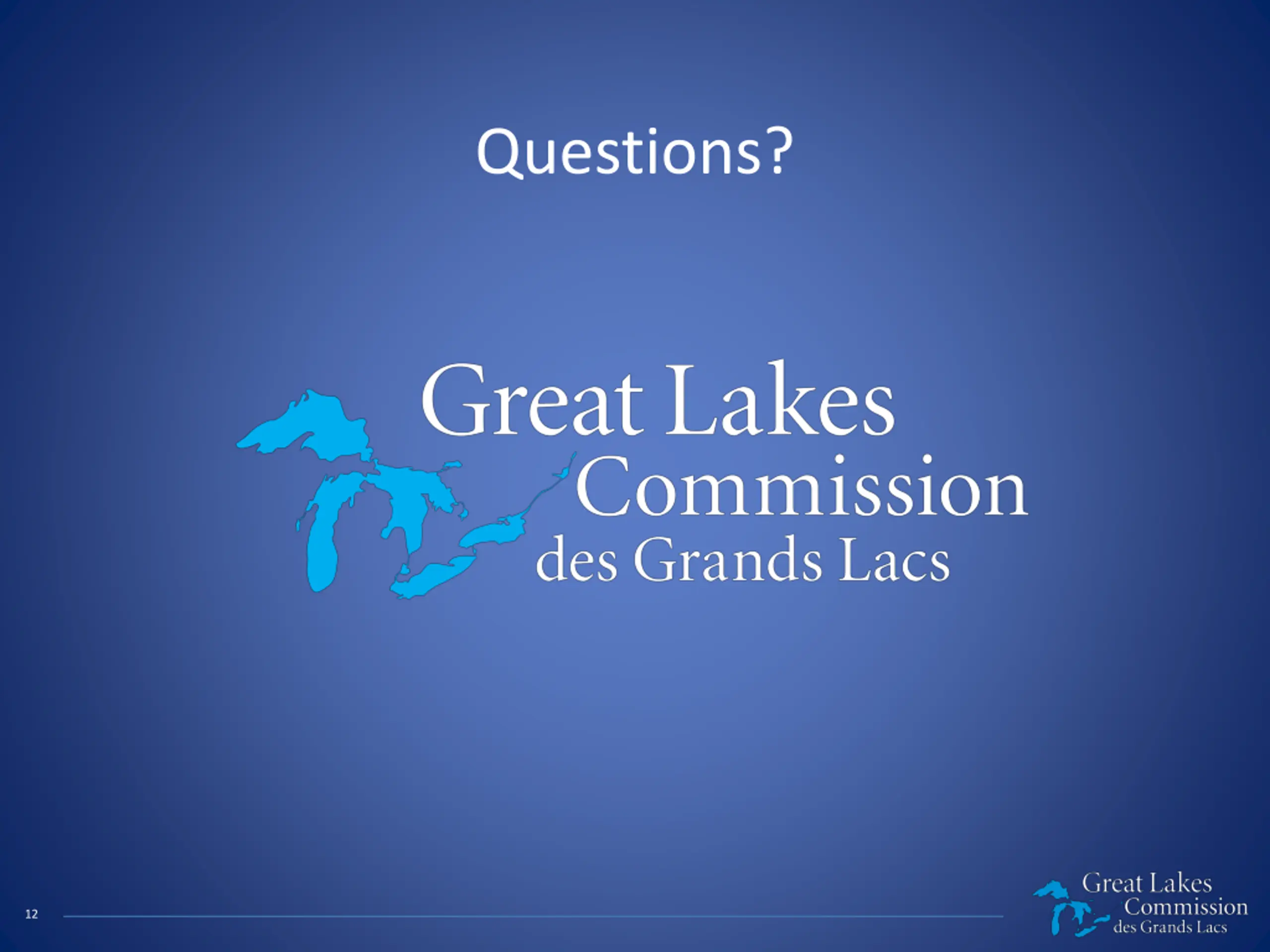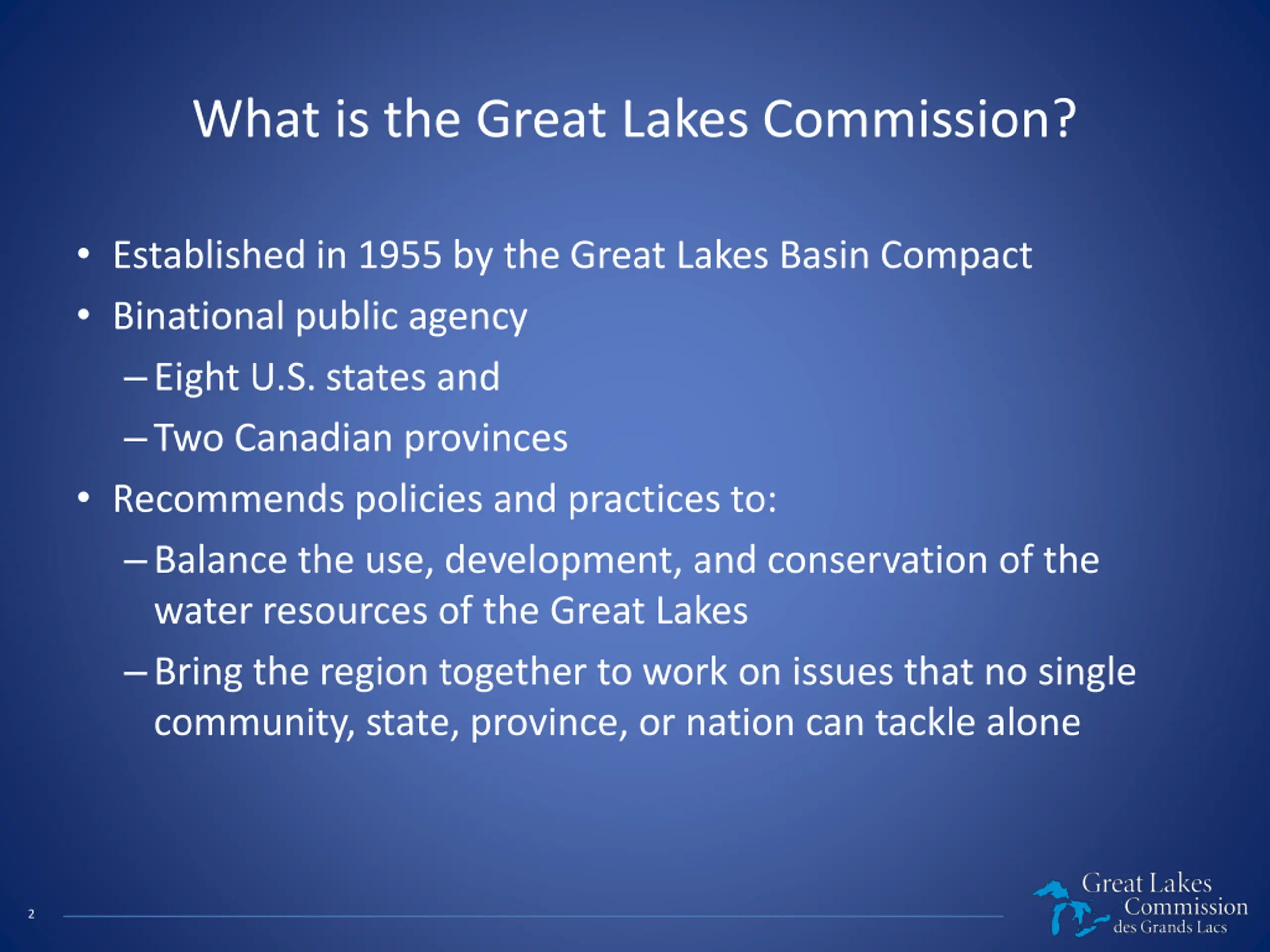 What is the Great Lakes Commission? Established in 1955 by the Great Lakes Basin Compact Binational public agency Eight U.S. states and Two Canadian provinces Recommends policies and practices to: Balance the use, development, and conservation of the water resources of the Great Lakes Bring the region together to work on issues that no single community, state, province, or nation can tackle alone 2