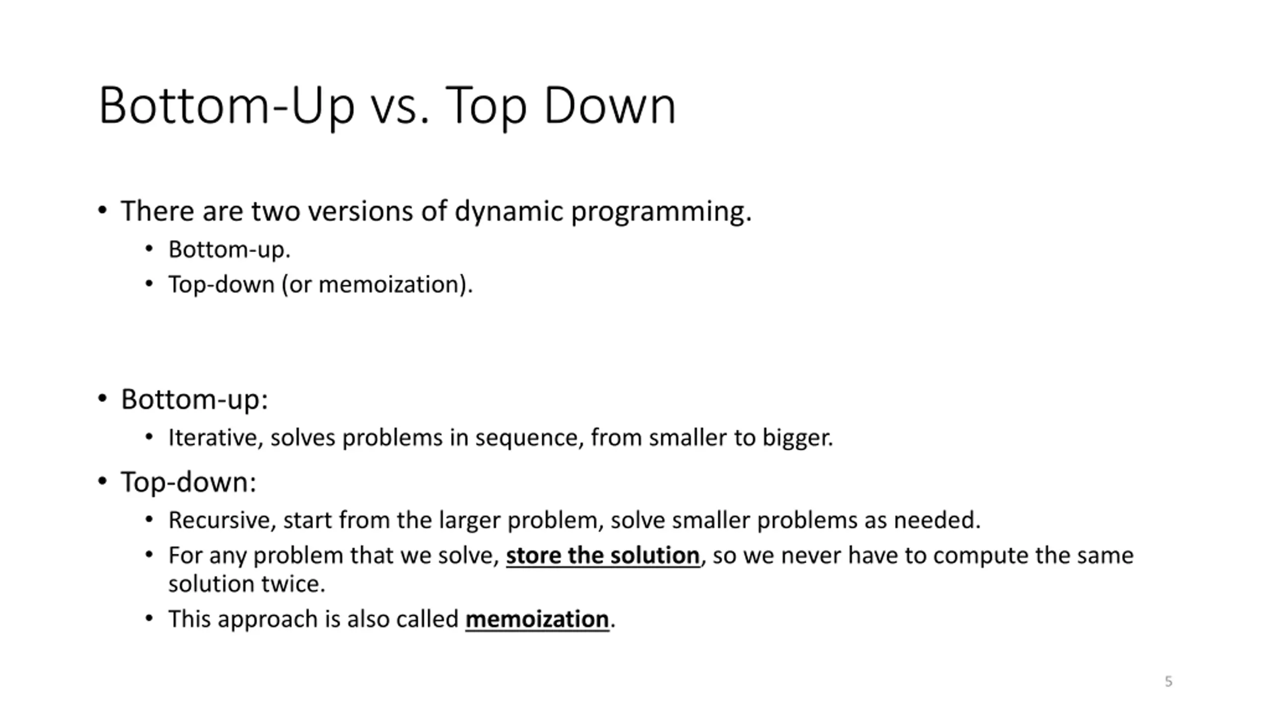 Bottom-Up vs. Top Down There are two versions of dynamic programming. Bottom-up. Top-down (or memoization). Bottom-up: Iterative, solves problems in sequence, from smaller to bigger. Top-down: Recursive, start from the larger problem, solve smaller problems as needed. For any problem that we solve, store the solution, so we never have to compute the same solution twice. This approach is also called memoization. 5