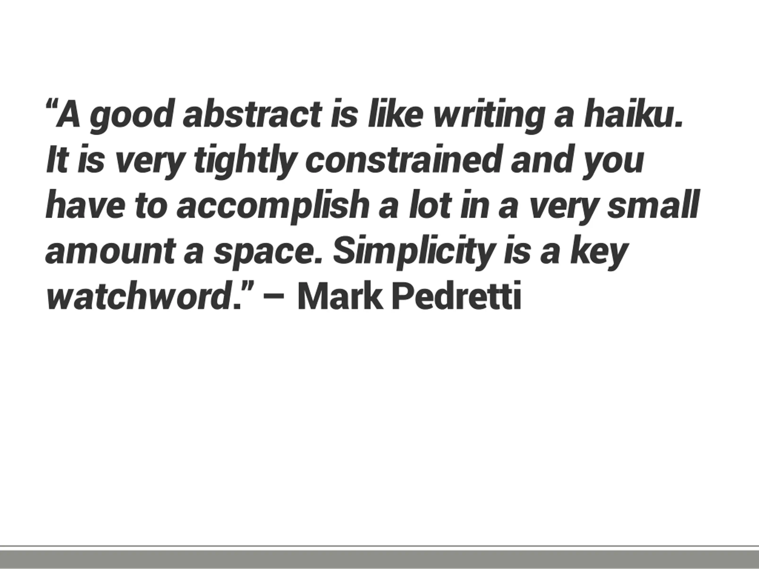 A good abstract is like writing a haiku. It is very tightly constrained and you have to accomplish a lot in a very small amount a space. Simplicity is a key watchword. Mark Pedretti