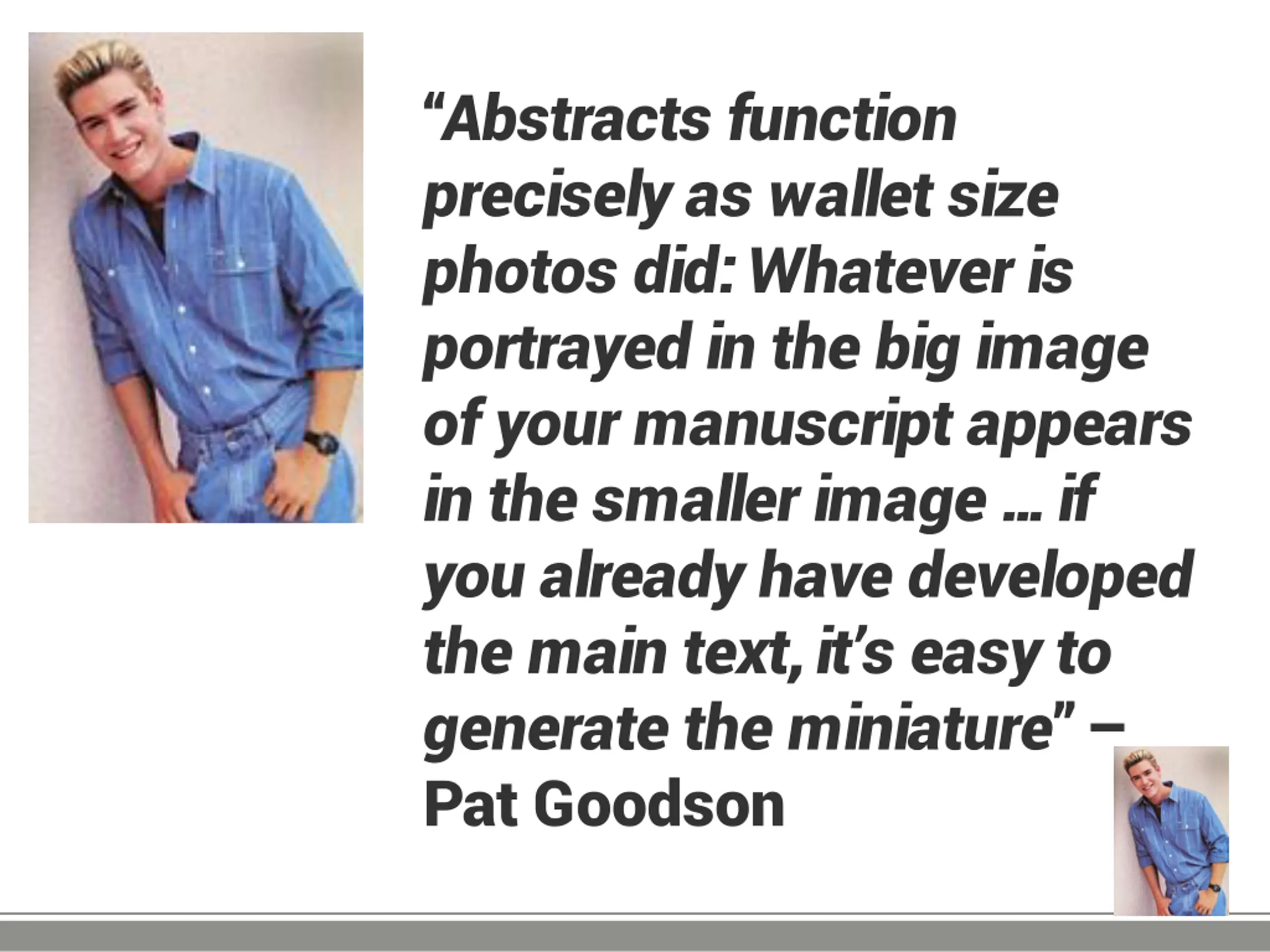 Abstracts function precisely as wallet size photos did: Whatever is portrayed in the big image of your manuscript appears in the smaller image if you already have developed the main text, it s easy to generate the miniature Pat Goodson