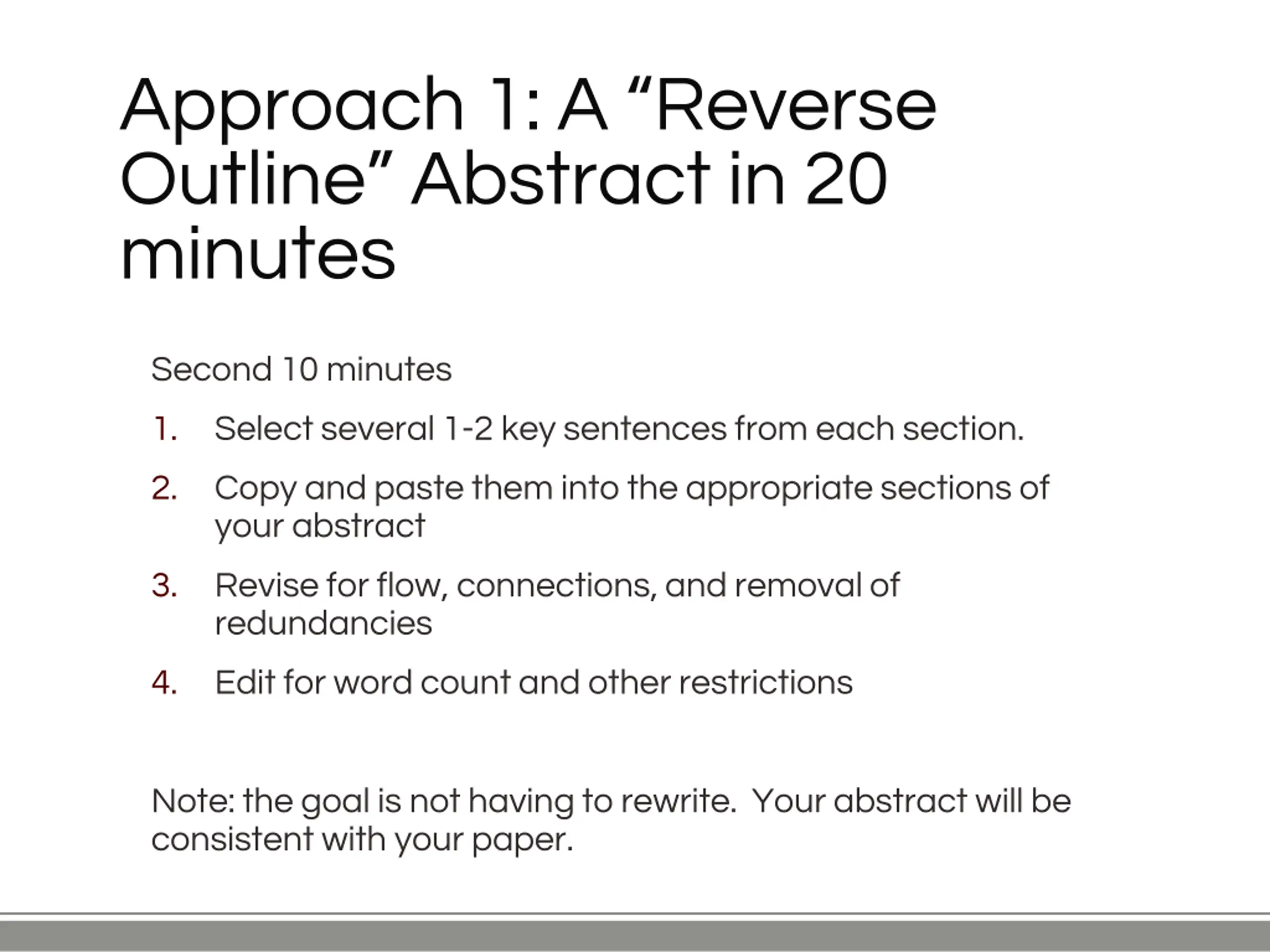 Approach 1: A Reverse Outline Abstract in 20 minutes Second 10 minutes 1. Select several 1-2 key sentences from each section. 2. Copy and paste them into the appropriate sections of your abstract 3. Revise for flow, connections, and removal of redundancies 4. Edit for word count and other restrictions Note: the goal is not having to rewrite. Your abstract will be consistent with your paper.