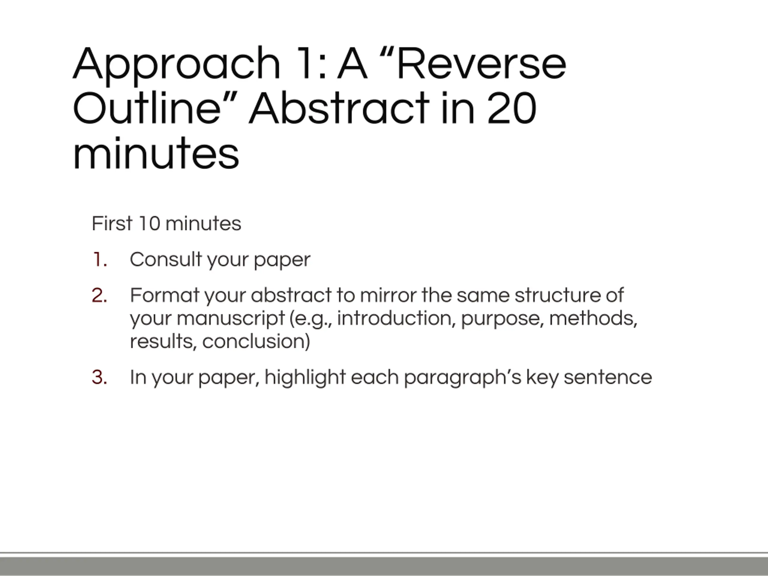 Approach 1: A Reverse Outline Abstract in 20 minutes First 10 minutes 1. Consult your paper 2. Format your abstract to mirror the same structure of your manuscript (e.g., introduction, purpose, methods, results, conclusion) 3. In your paper, highlight each paragraph s key sentence