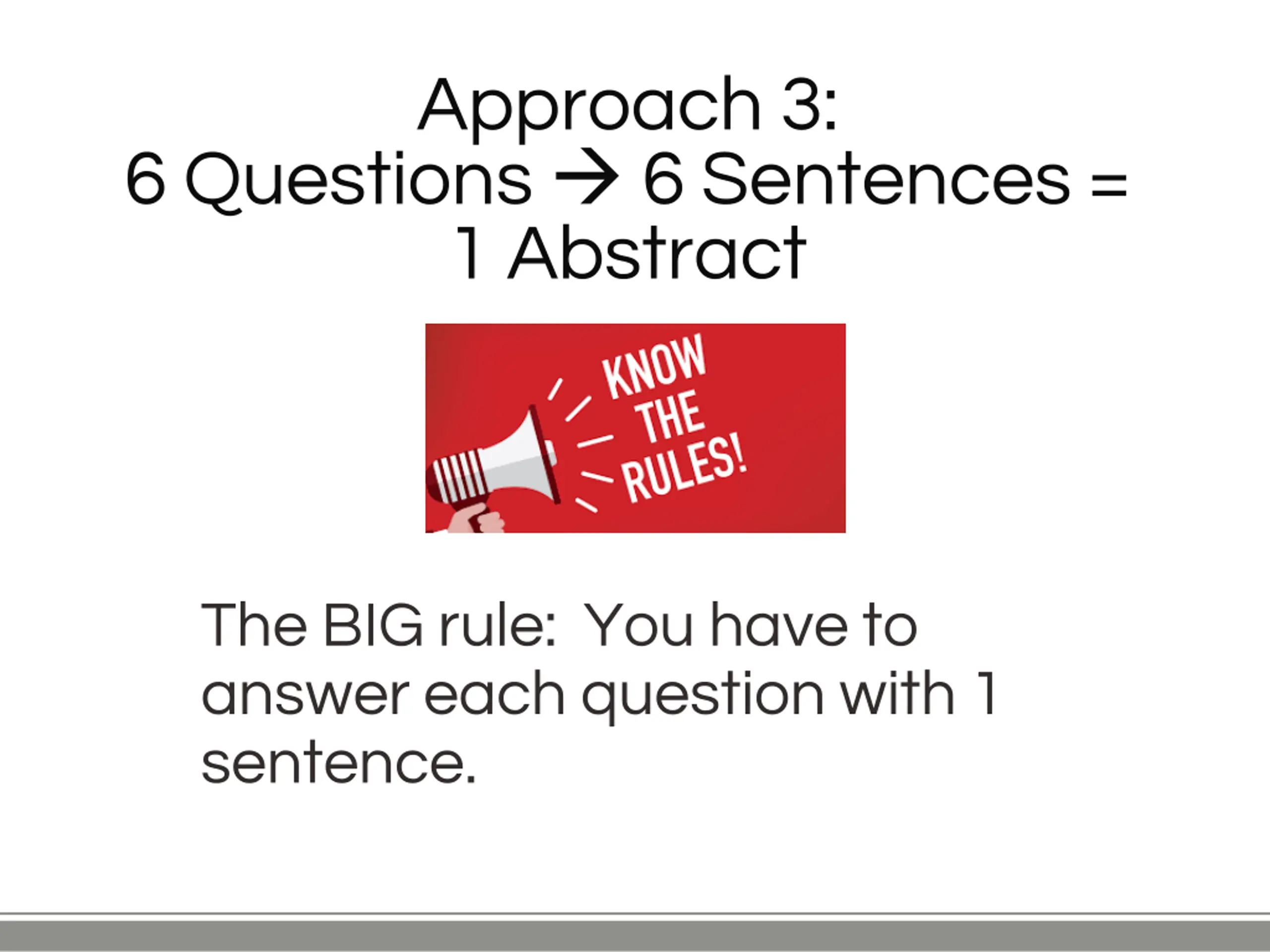 Approach 3: 6 Questions 6 Sentences = 1 Abstract The BIG rule: You have to answer each question with 1 sentence.