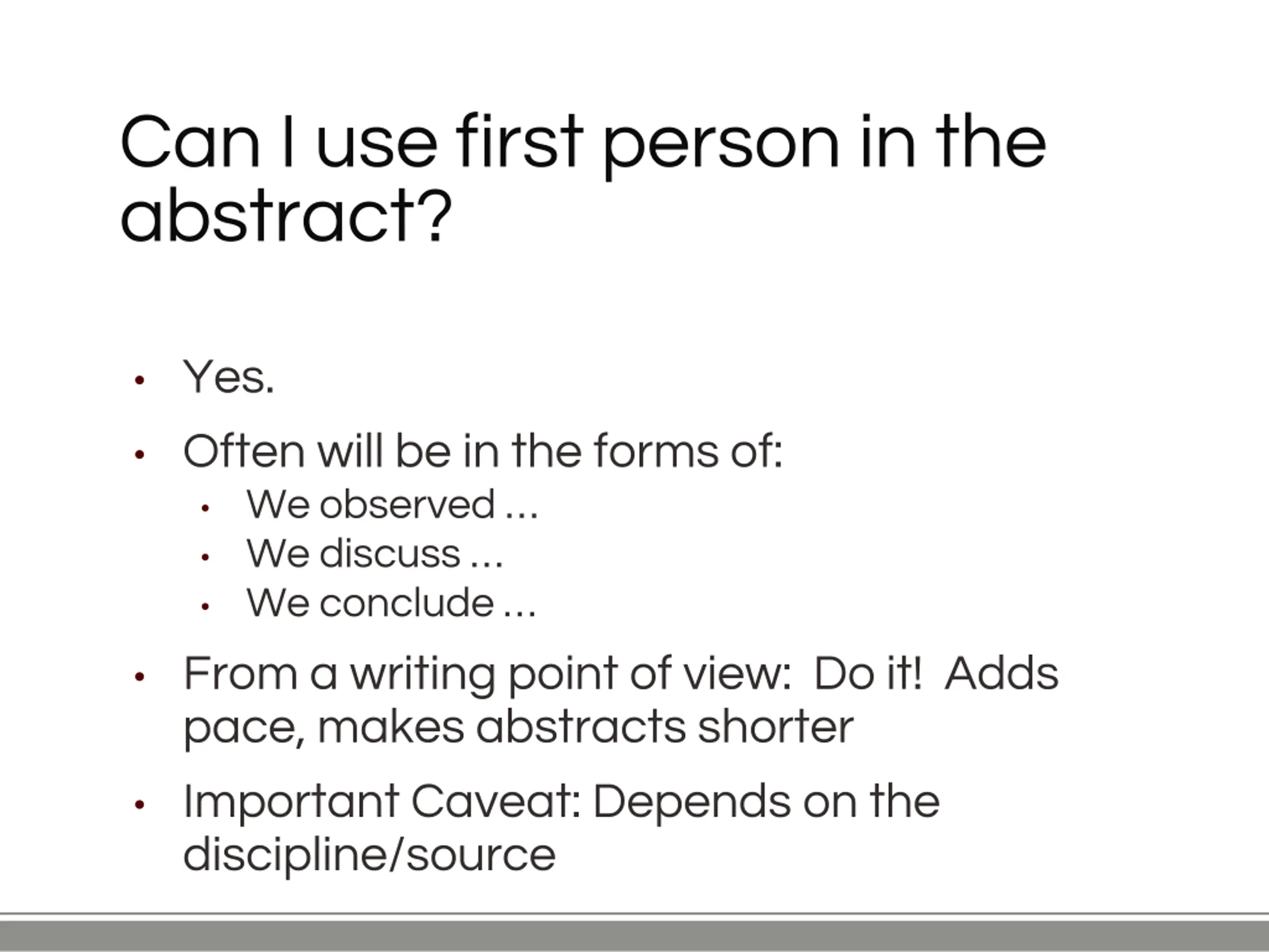 Can I use first person in the abstract? Yes. Often will be in the forms of: We observed We discuss We conclude From a writing point of view: Do it! Adds pace, makes abstracts shorter Important Caveat: Depends on the discipline/source