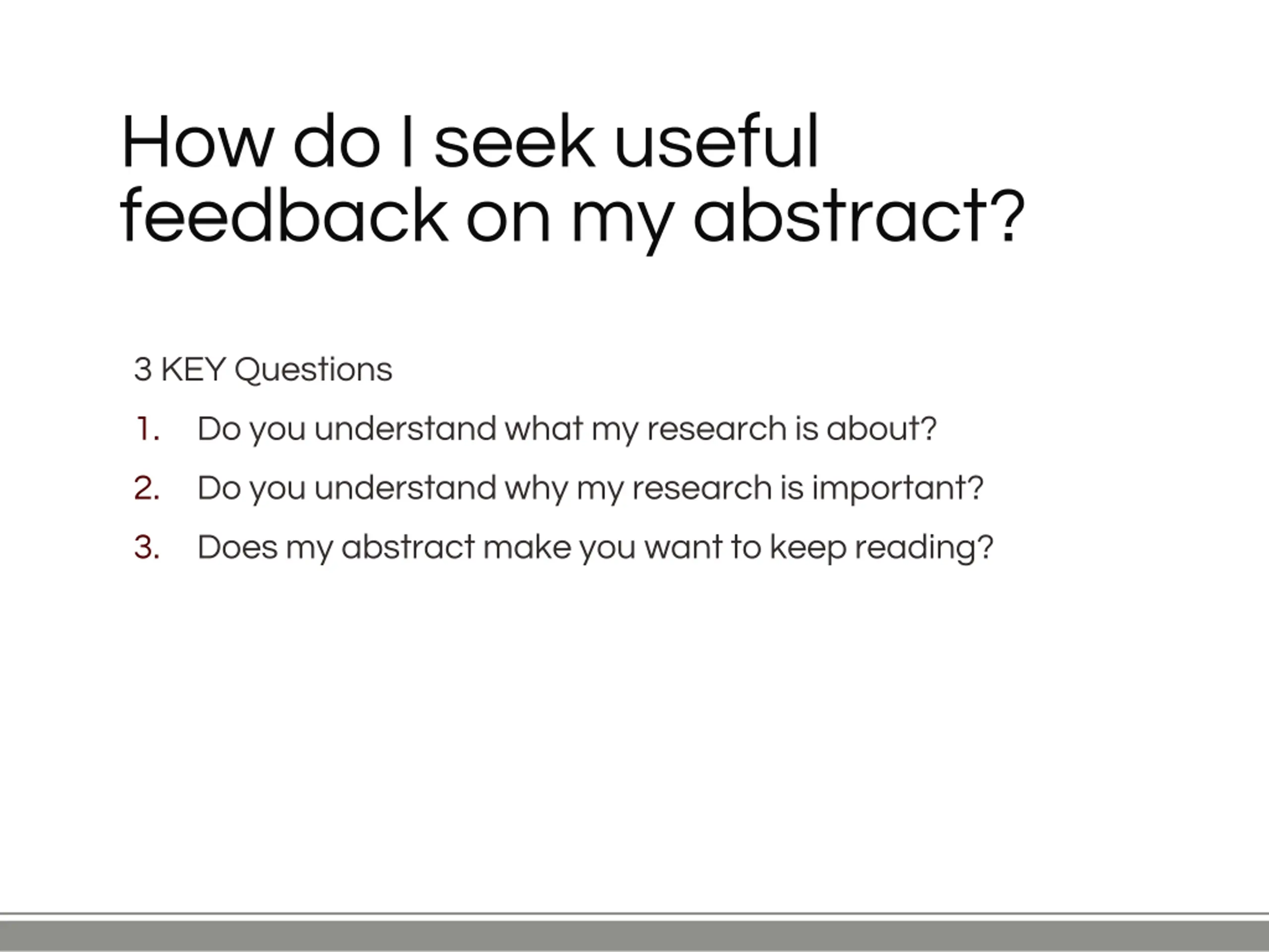 How do I seek useful feedback on my abstract? 3 KEY Questions 1. Do you understand what my research is about? 2. Do you understand why my research is important? 3. Does my abstract make you want to keep reading?