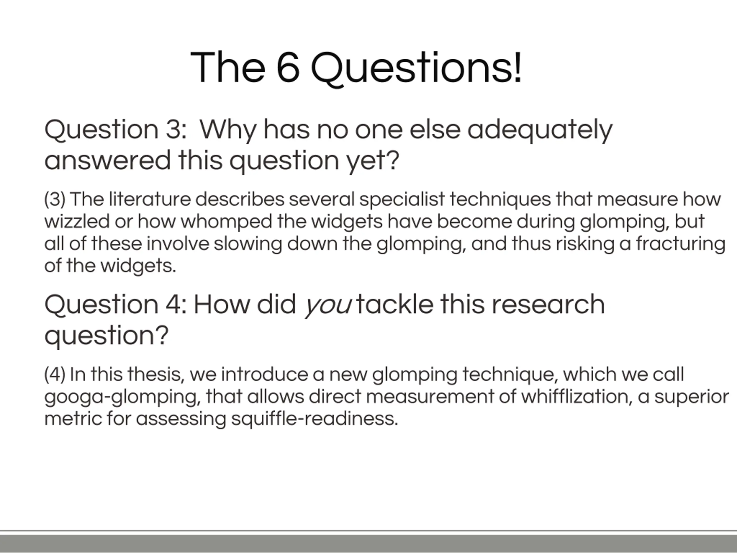 The 6 Questions! Question 3: Why has no one else adequately answered this question yet? (3) The literature describes several specialist techniques that measure how wizzled or how whomped the widgets have become during glomping, but all of these involve slowing down the glomping, and thus risking a fracturing of the widgets. Question 4: How did you tackle this research question? (4) In this thesis, we introduce a new glomping technique, which we call googa-glomping, that allows direct measurement of whifflization, a superior metric for assessing squiffle-readiness.