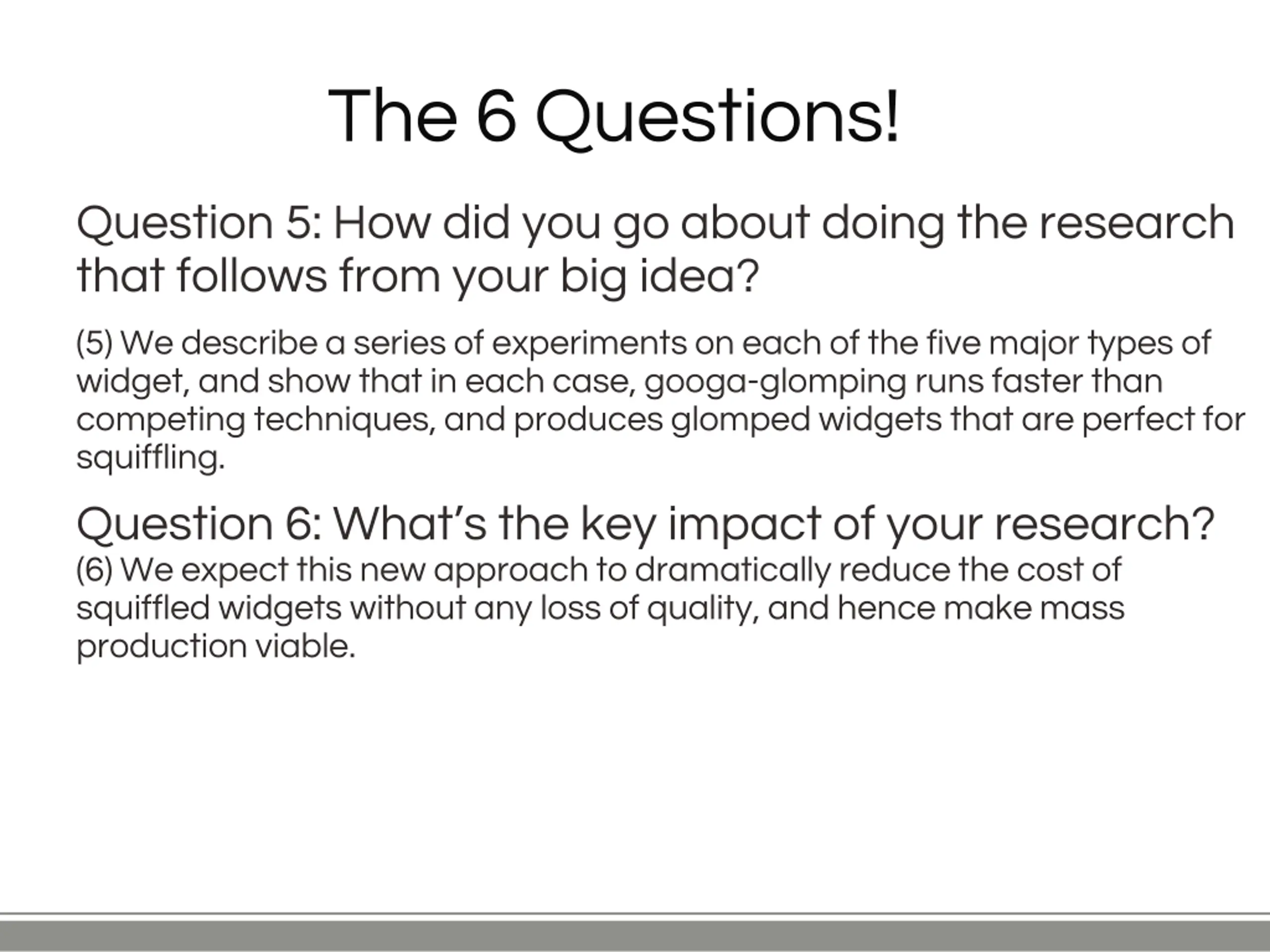 The 6 Questions! Question 5: How did you go about doing the research that follows from your big idea? (5) We describe a series of experiments on each of the five major types of widget, and show that in each case, googa-glomping runs faster than competing techniques, and produces glomped widgets that are perfect for squiffling. Question 6: What s the key impact of your research? (6) We expect this new approach to dramatically reduce the cost of squiffled widgets without any loss of quality, and hence make mass production viable.