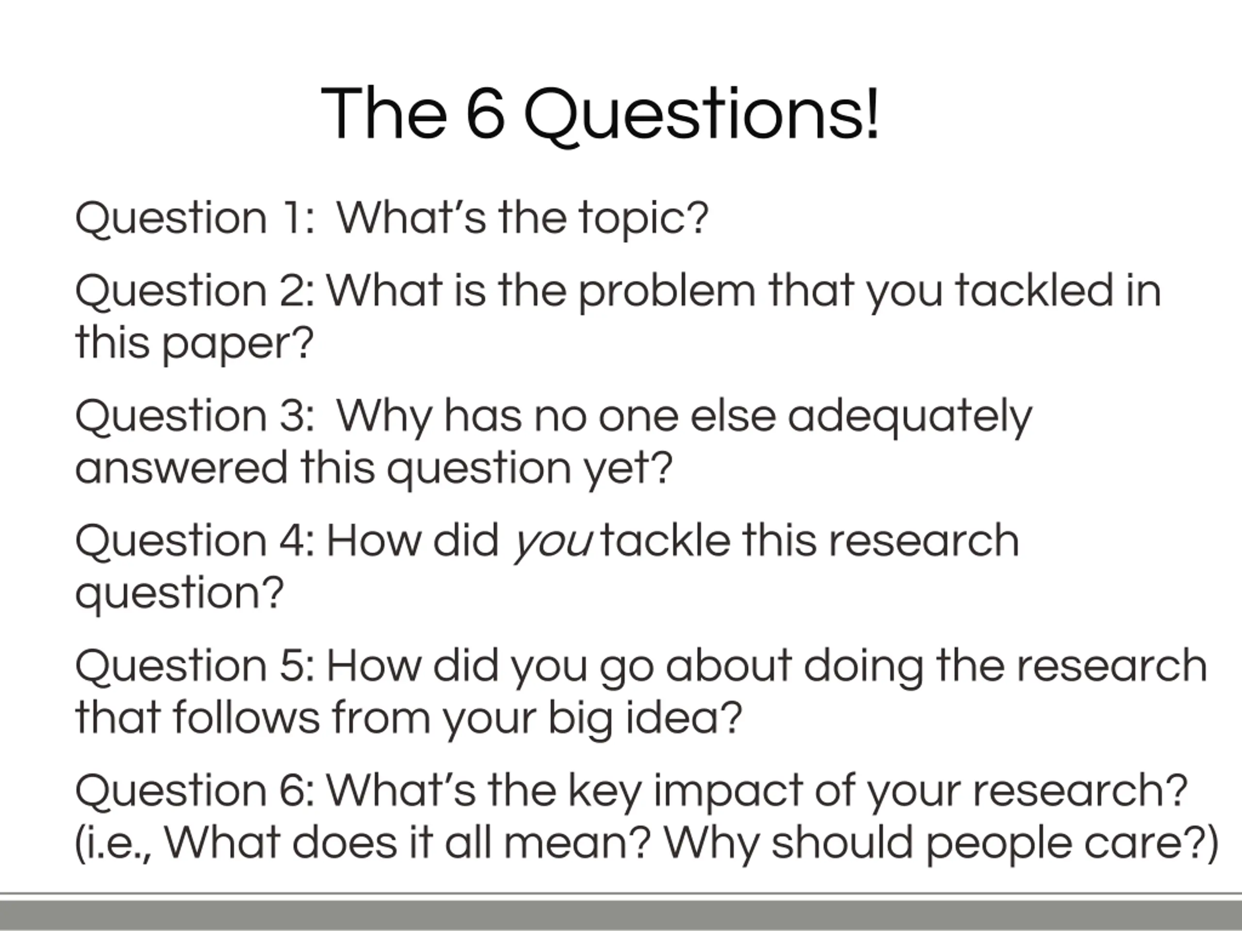 The 6 Questions! Question 1: What s the topic? Question 2: What is the problem that you tackled in this paper? Question 3: Why has no one else adequately answered this question yet? Question 4: How did you tackle this research question? Question 5: How did you go about doing the research that follows from your big idea? Question 6: What s the key impact of your research? (i.e., What does it all mean? Why should people care?)