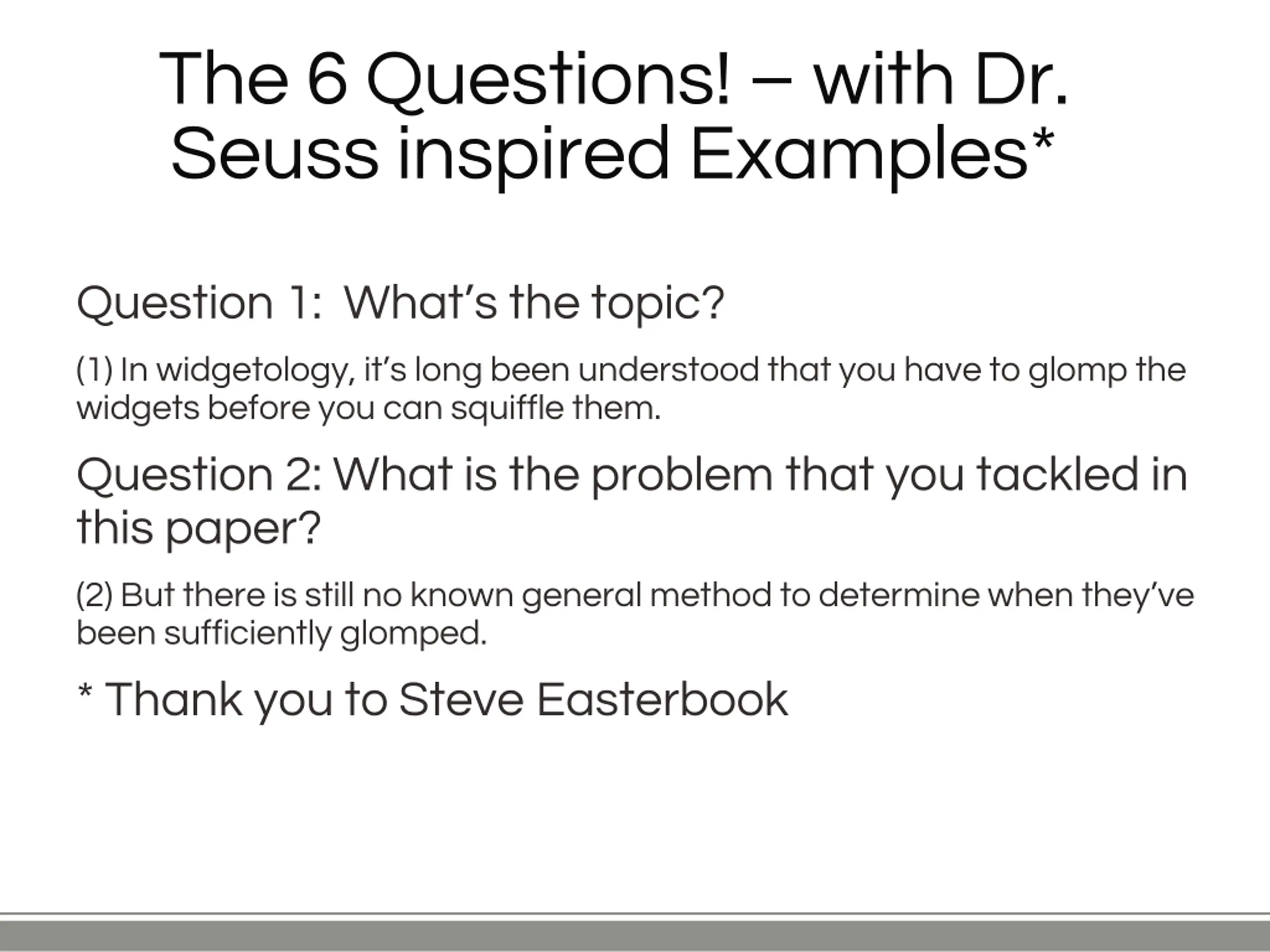 The 6 Questions! with Dr. Seuss inspired Examples* Question 1: What s the topic? (1) In widgetology, it s long been understood that you have to glomp the widgets before you can squiffle them. Question 2: What is the problem that you tackled in this paper? (2) But there is still no known general method to determine when they ve been sufficiently glomped. * Thank you to Steve Easterbook