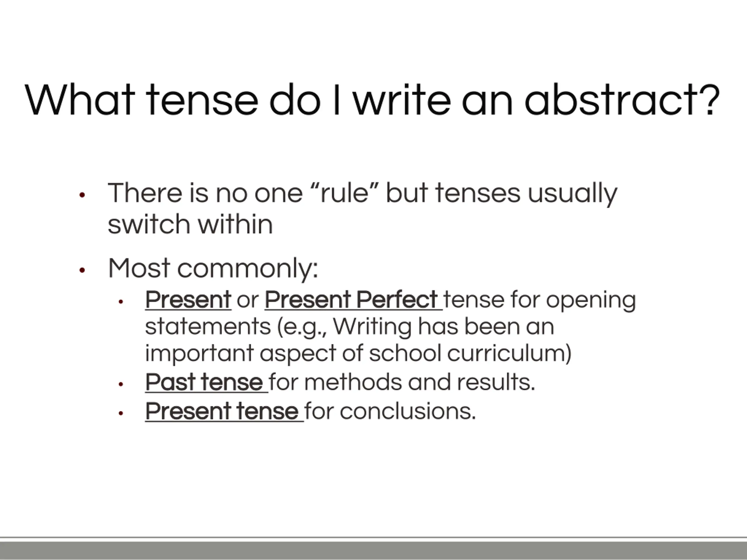 What tense do I write an abstract? There is no one rule but tenses usually switch within Most commonly: Present Present or Present Perfect statements (e.g., Writing has been an important aspect of school curriculum) Past tense Past tense for methods and results. Present tense Present tense for conclusions. Present Perfect tense for opening