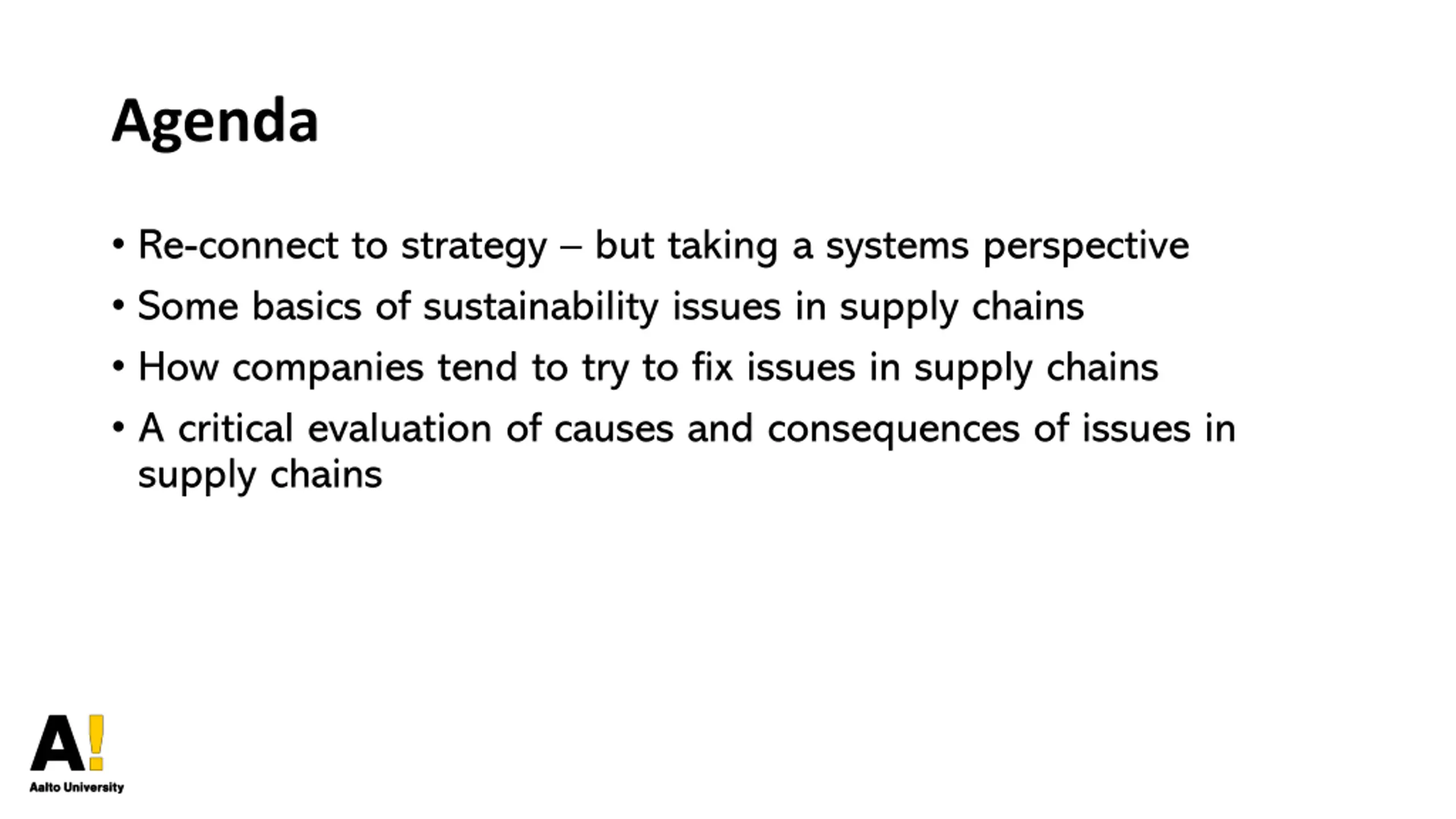 Agenda Re-connect to strategy but taking a systems perspective Some basics of sustainability issues in supply chains How companies tend to try to fix issues in supply chains A critical evaluation of causes and consequences of issues in supply chains
