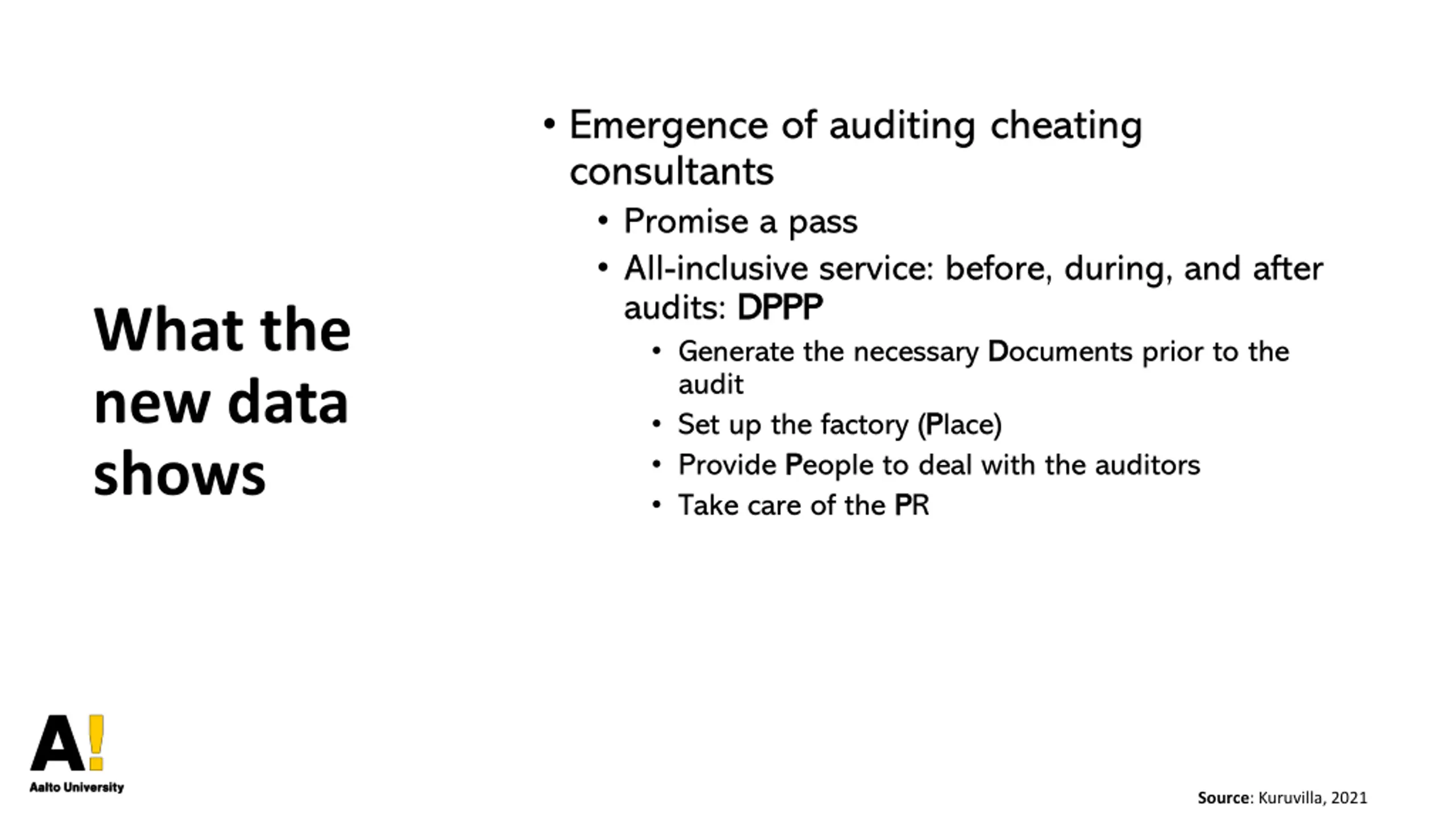 Emergence of auditing cheating consultants Promise a pass All-inclusive service: before, during, and after audits: DPPP DPPP Generate the necessary D Documents prior to the audit Set up the factory (P Place) Provide P People to deal with the auditors Take care of the P PR What the new data shows Source: Kuruvilla, 2021