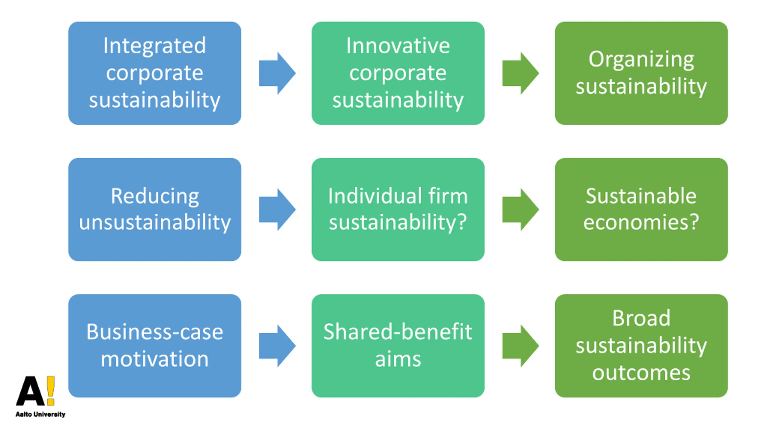 Integrated corporate sustainability Innovative corporate sustainability Organizing sustainability Reducing unsustainability Individual firm sustainability? Sustainable economies? Broad Business-case motivation Shared-benefit aims sustainability outcomes