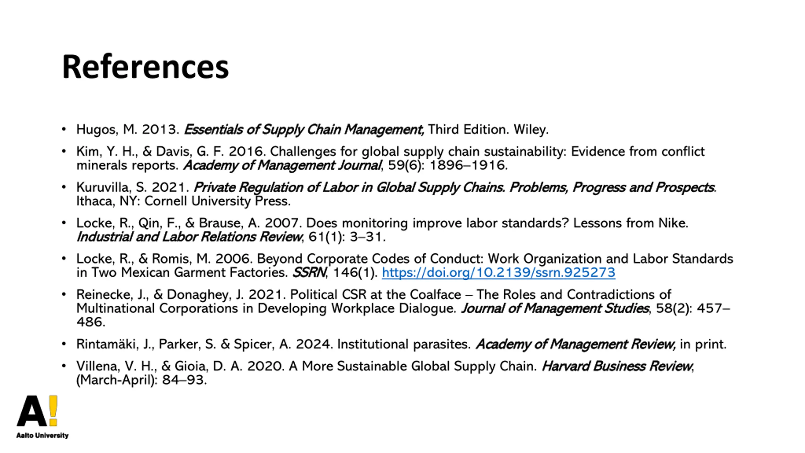 References Hugos, M. 2013. Essentials of Supply Chain Management, Essentials of Supply Chain Management, Third Edition. Wiley. Kim, Y. H., & Davis, G. F. 2016. Challenges for global supply chain sustainability: Evidence from conflict minerals reports. Academy of Management Journal Academy of Management Journal, 59(6): 1896 1916. Kuruvilla, S. 2021. Private Regulation of Labor in Global Supply Chains. Problems, Progress and Prospects Private Regulation of Labor in Global Supply Chains. Problems, Progress and Prospects. Ithaca, NY: Cornell University Press. Locke, R., Qin, F., & Brause, A. 2007. Does monitoring improve labor standards? Lessons from Nike. Industrial and Labor Relations Review Industrial and Labor Relations Review, 61(1): 3 31. Locke, R., & Romis, M. 2006. Beyond Corporate Codes of Conduct: Work Organization and Labor Standards in Two Mexican Garment Factories. SSRN SSRN, 146(1). https://doi.org/10.2139/ssrn.925273 Reinecke, J., & Donaghey, J. 2021. Political CSR at the Coalface The Roles and Contradictions of Multinational Corporations in Developing Workplace Dialogue. Journal of Management Studies 486. Rintam ki, J., Parker, S. & Spicer, A. 2024. Institutional parasites. Academy of Management Review, Villena, V. H., & Gioia, D. A. 2020. A More Sustainable Global Supply Chain. Harvard Business Review (March-April): 84 93. Journal of Management Studies, 58(2): 457 Academy of Management Review, in print. Harvard Business Review,