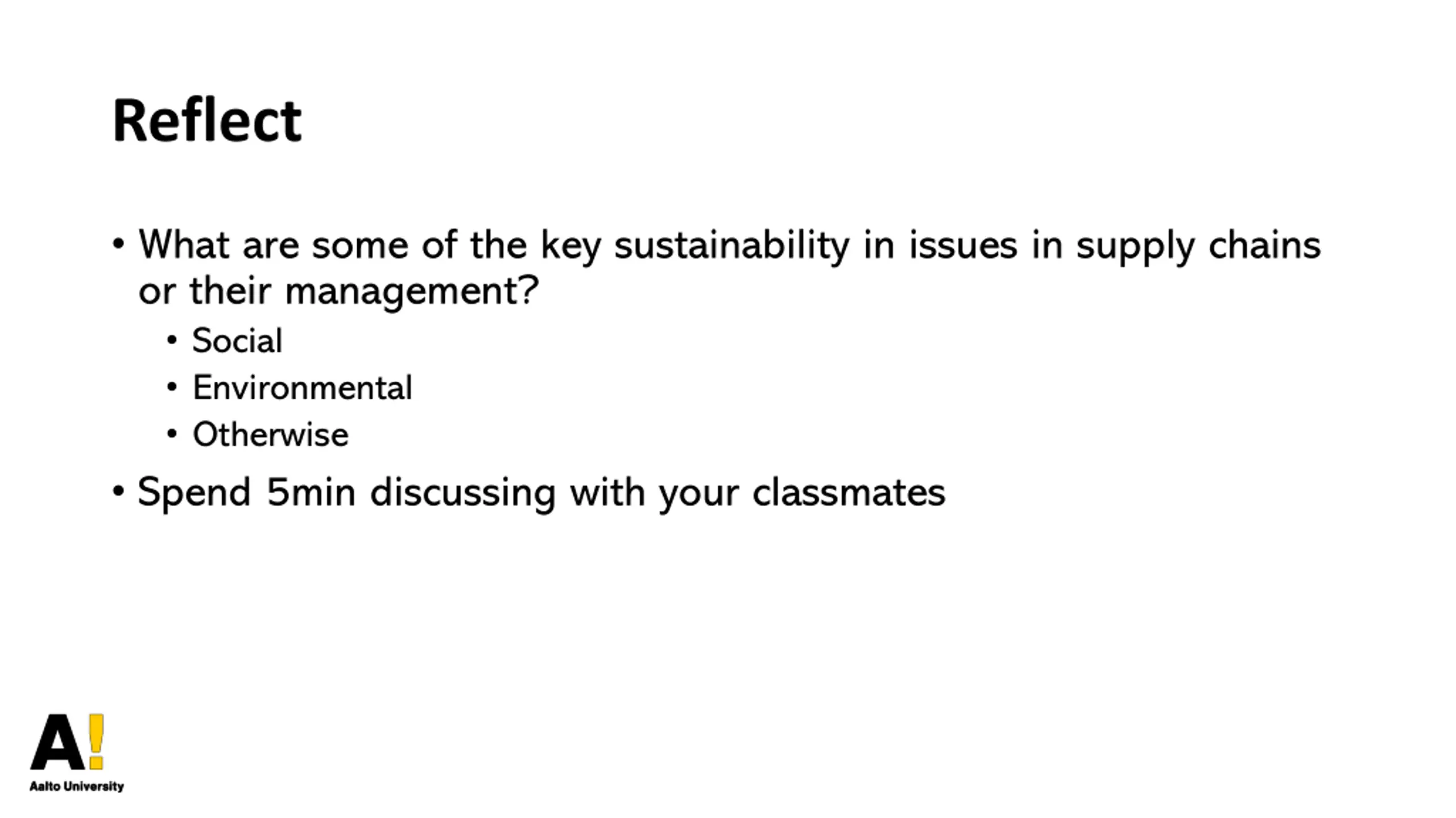 Reflect What are some of the key sustainability in issues in supply chains or their management? Social Environmental Otherwise Spend 5min discussing with your classmates