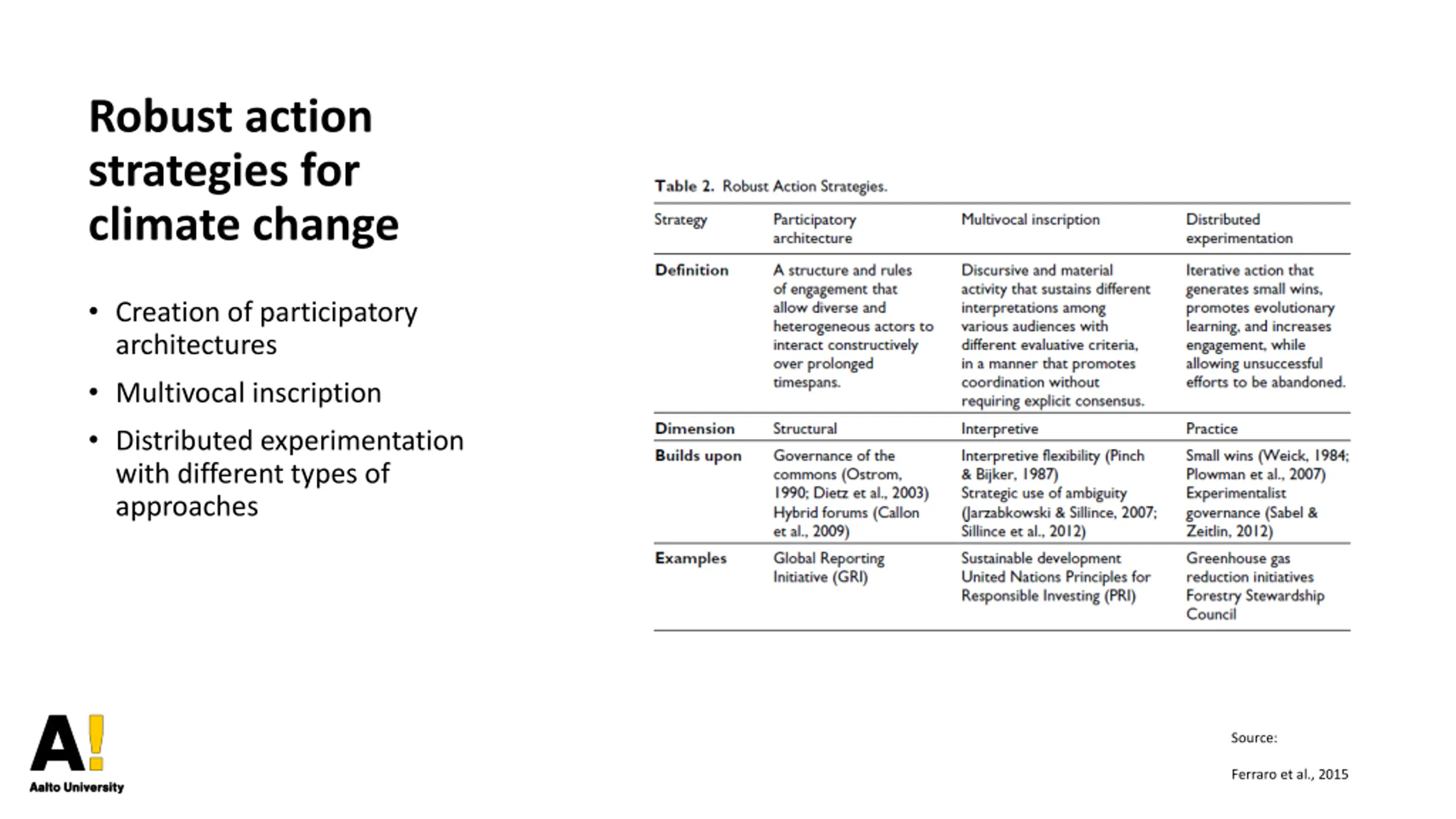 Robust action strategies for climate change Creation of participatory architectures Multivocal inscription Distributed experimentation with different types of approaches Source: Ferraro et al., 2015
