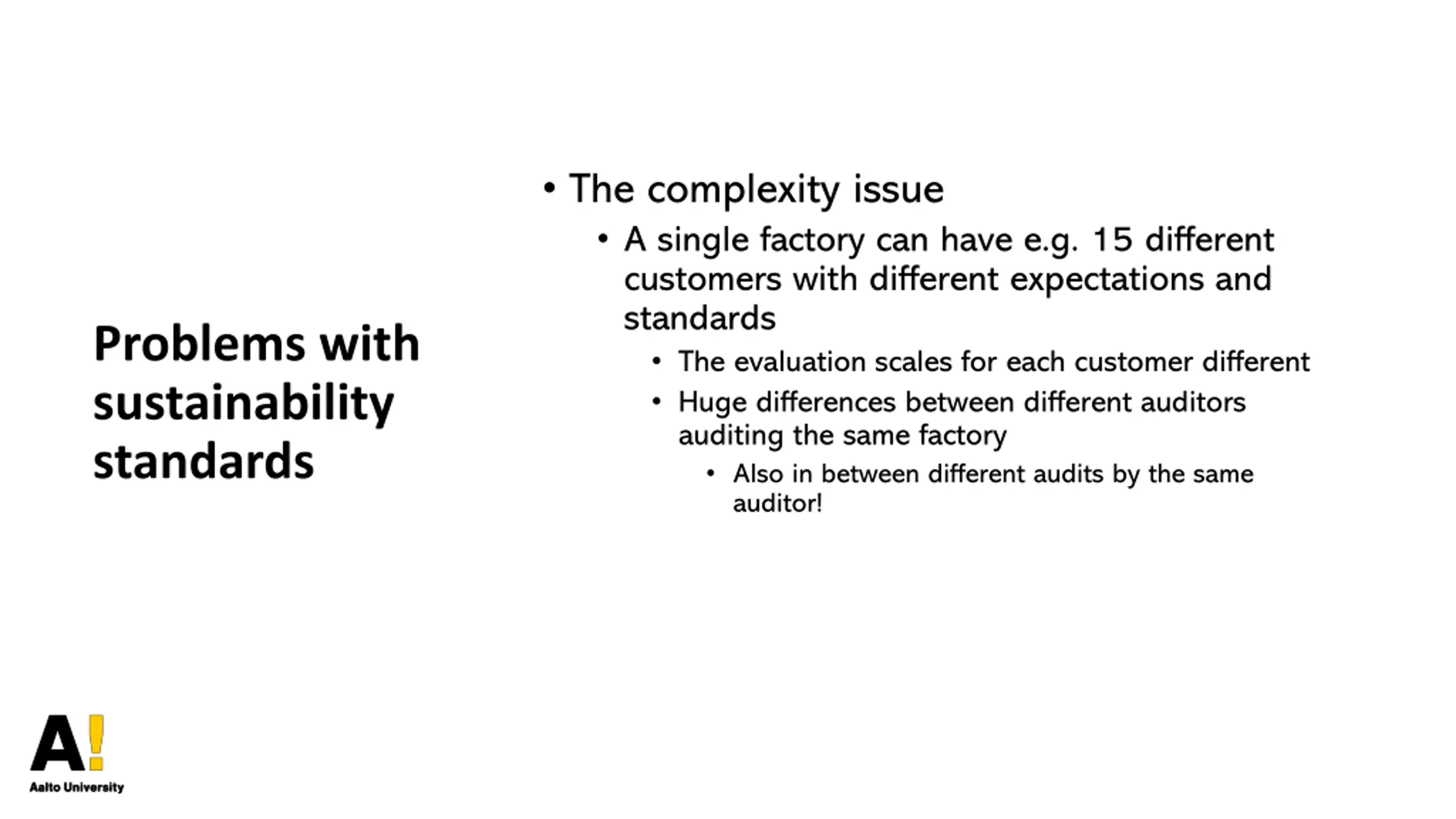 The complexity issue A single factory can have e.g. 15 different customers with different expectations and standards The evaluation scales for each customer different Huge differences between different auditors auditing the same factory Also in between different audits by the same auditor! Problems with sustainability standards