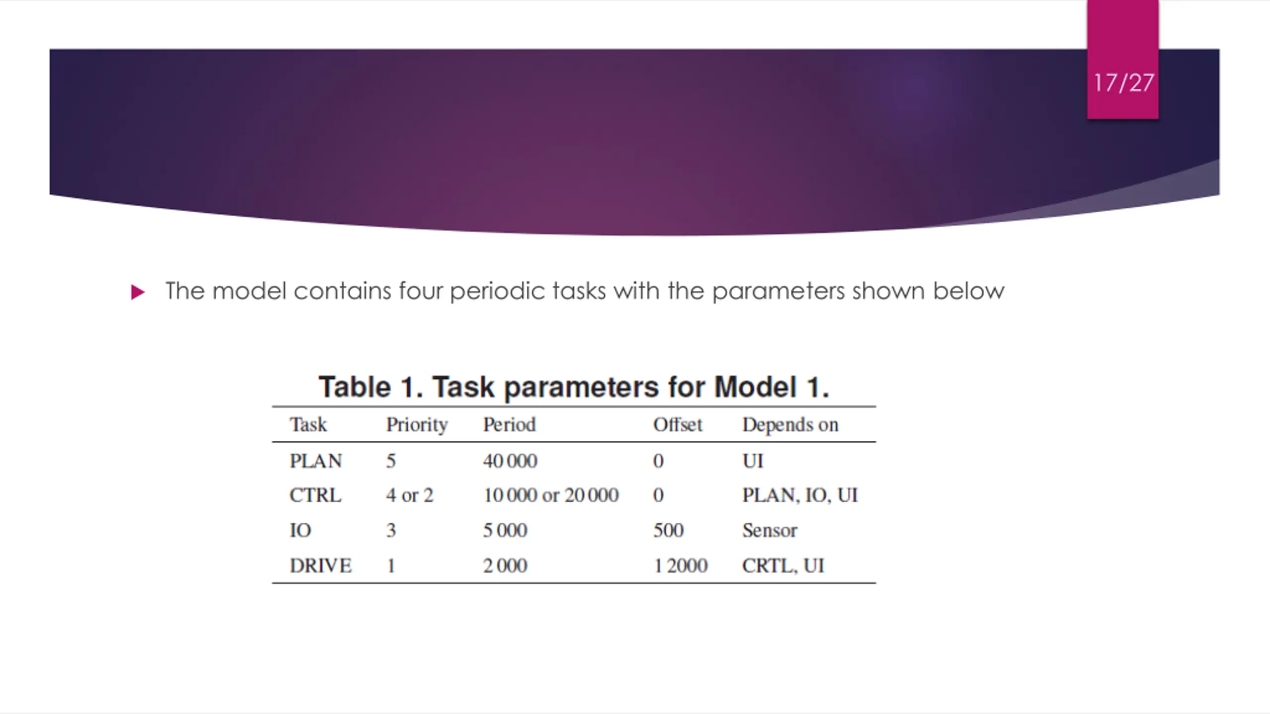 16/27 Evaluation Models: Model 1 (M1) M1 is representing a control system for industrial robots developed by ABB Robotics Behavioral mechanisms which RTA cannot take into account: Tasks with intricate dependencies in temporal behavior due to IPC and GSSVs The use of buffered message queues for IPC, where triggering messages may be delayed Tasks that change scheduling priority or periods dynamically, in response to system events The modeled system controls a set of electric motors based on periodic sensor readings and aperiodic events Describes behavior with a significant impact on the temporal behavior of the system, such as resource usage (e.g., CPU time), task interactions and important state changes