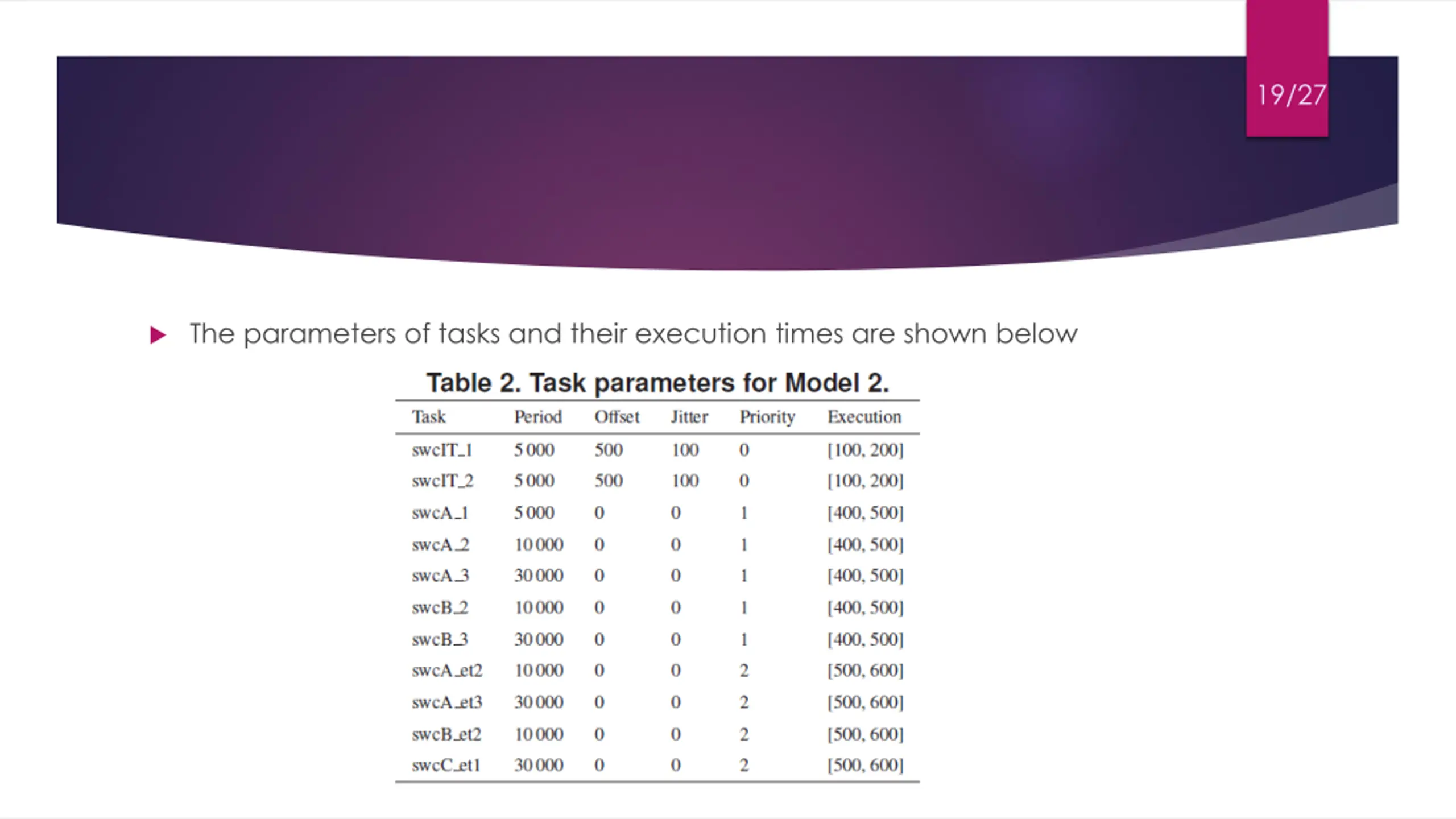 18/27 Model 2 (M2) Based on a test application from Arcticus systems, developers of the Rubus RTOS, used in heavy vehicles Uses a pipe-and-filter architecture, where tasks trigger other tasks through trigger ports, forming transactions 3 periodic transactions and one interrupt-driven task, in total 11 tasks There exist no shared variables or IPC via message passing which can impact the tasks timing and functional behavior Tasks have large variations in execution times, which makes the state space of this model very large