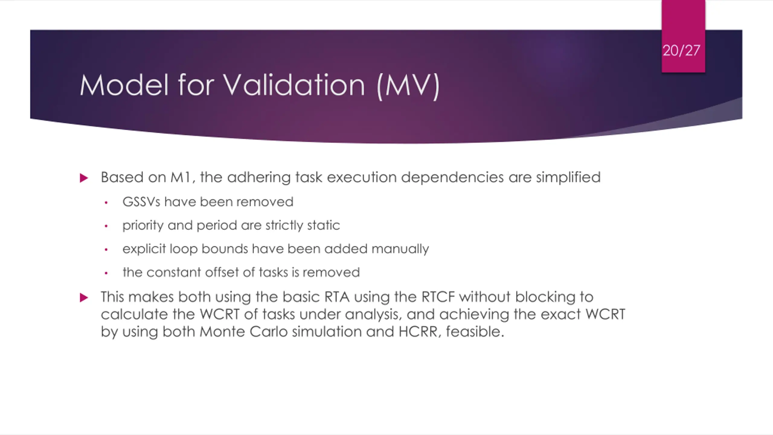 20/27 Model for Validation (MV) Based on M1, the adhering task execution dependencies are simplified GSSVs have been removed priority and period are strictly static explicit loop bounds have been added manually the constant offset of tasks is removed This makes both using the basic RTA using the RTCF without blocking to calculate the WCRT of tasks under analysis, and achieving the exact WCRT by using both Monte Carlo simulation and HCRR, feasible.